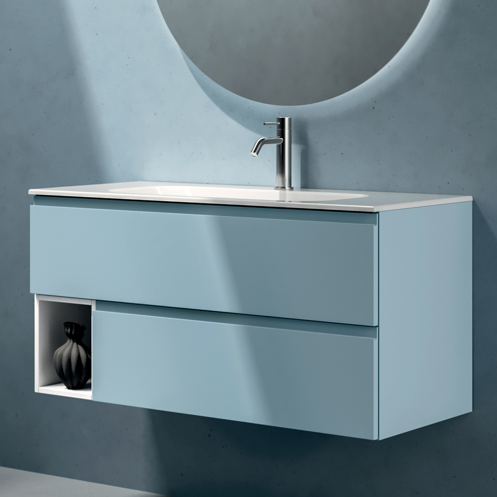 Cette composition offre une interprétation fraîche et contemporaine du mobilier de salle de bains, caractérisée par des volumes suspendus, des finitions mates et des teintes délicates qui apportent luminosité et légèreté à l'espace.