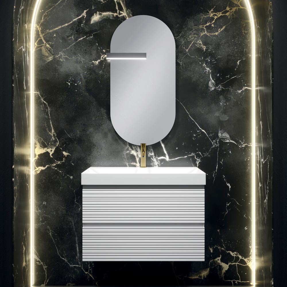 Composition de salle de bains suspendue élégante au design contemporain, conçue pour les environnements raffinés où esthétique, lumière et fonctionnalité se conjuguent harmonieusement.