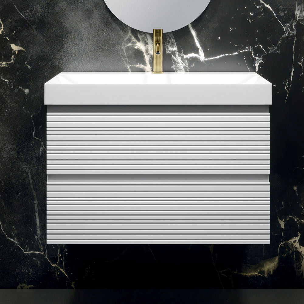 Ce meuble de salle de bains suspendu à deux tiroirs , réalisé dans une élégante finition blanc mat , offre un espace de rangement généreux et une esthétique épurée, idéale pour sublimer les environnements modernes et lumineux.