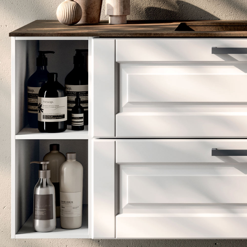 Le meuble bas mural, doté d'un double tiroir et de compartiments ouverts, se distingue par ses lignes épurées et son design essentiel, conçu pour offrir un équilibre visuel et une fonctionnalité au quotidien. L'évier intégré en grès cérame rehausse la surface d'un effet texturé profond, inspiré des teintes naturelles des métaux oxydés.