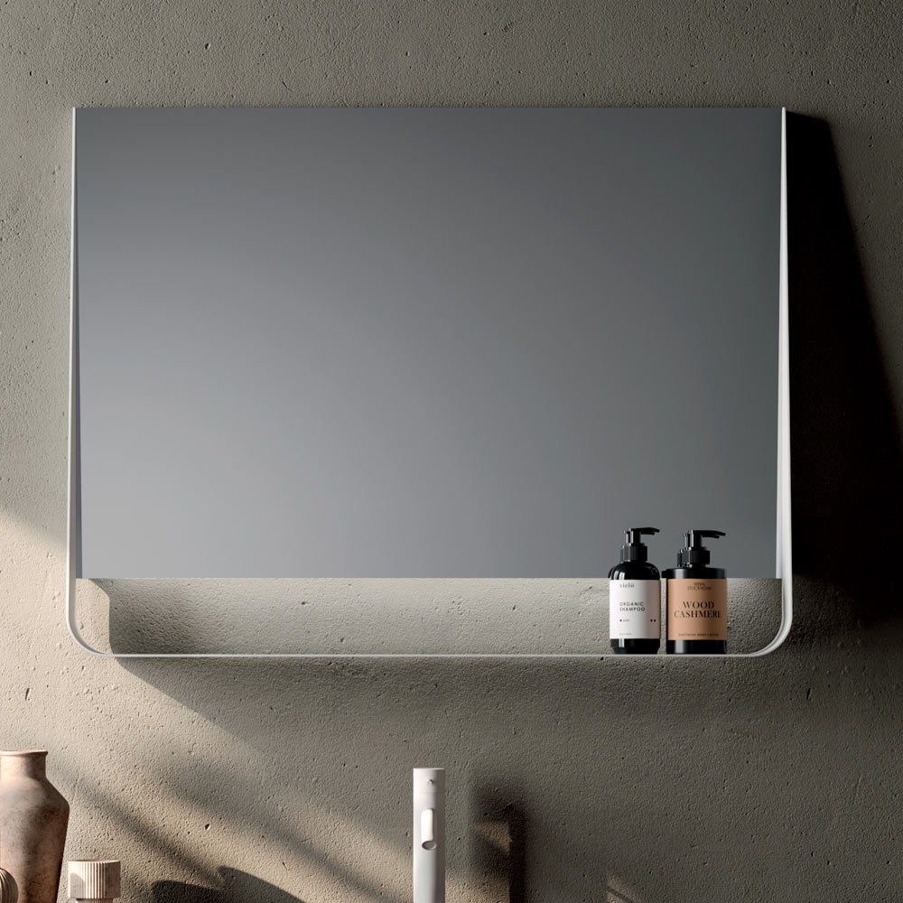 Le miroir de forme particulière complète la composition avec un design graphique audacieux, amplifiant la luminosité de la pièce et contribuant à créer une atmosphère moderne et raffinée.