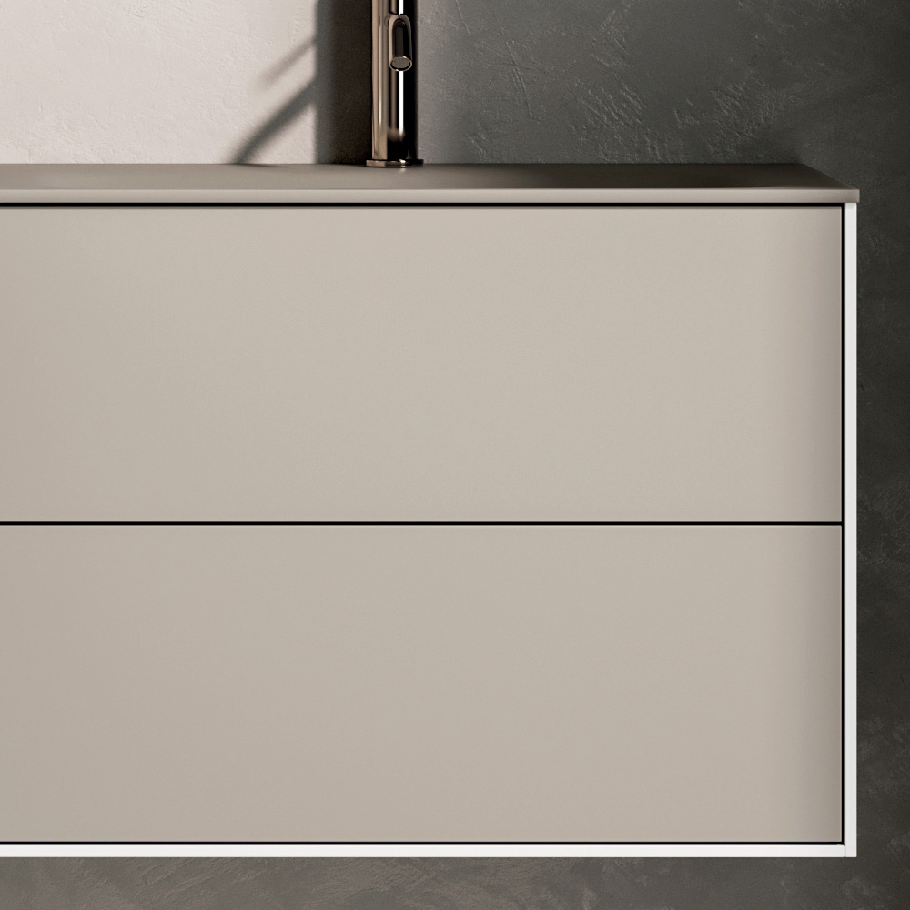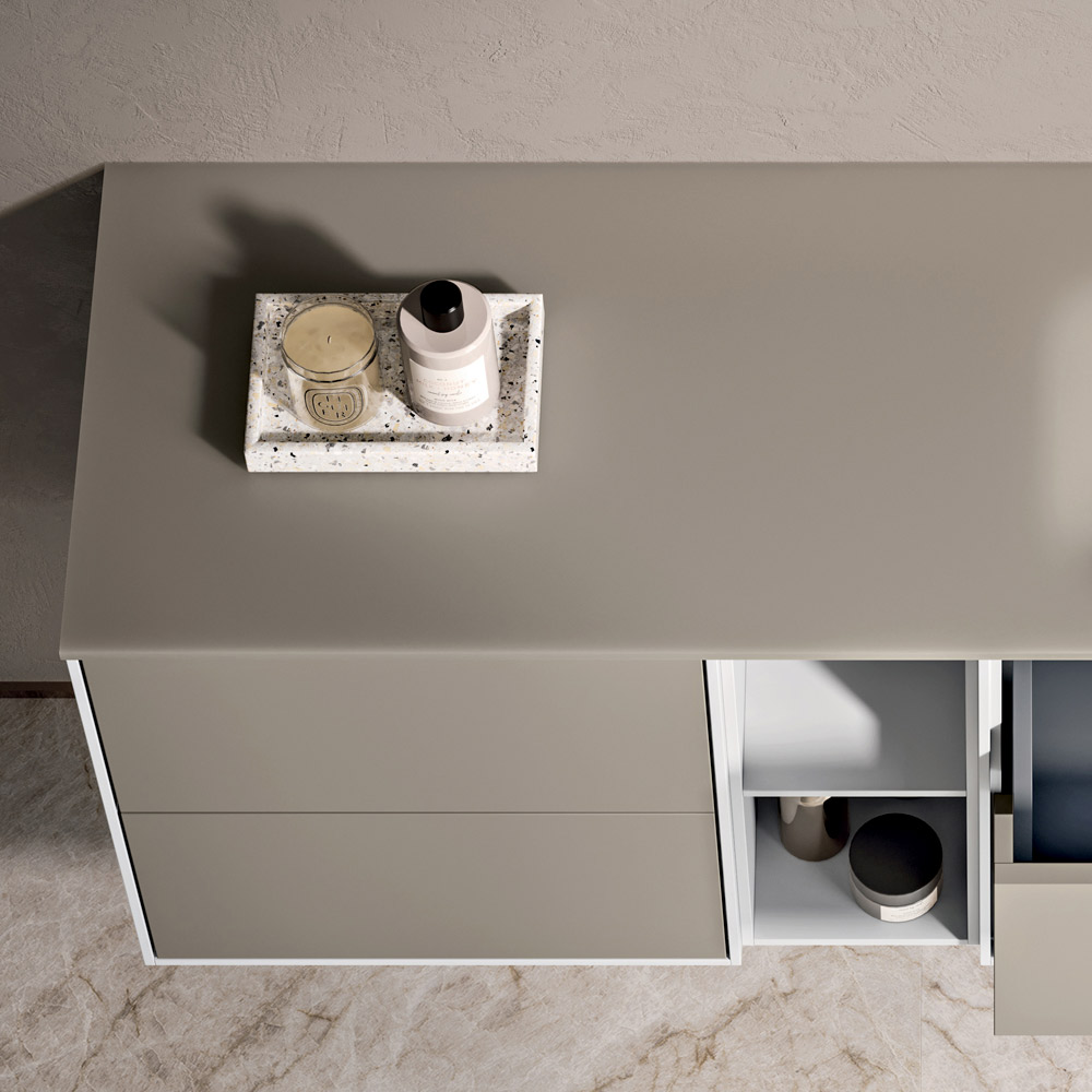 Une solution idéale pour ceux qui recherchent un meuble de salle de bains suspendu moderne gris tourterelle , capable d'allier esthétique minimaliste, matériaux raffinés et praticité maximale au quotidien.