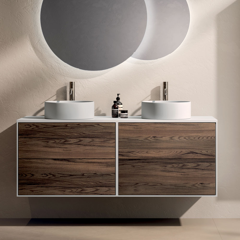 Les vasques rondes en céramique blanche brillante se détachent avec élégance de la surface, accentuant la légèreté visuelle de l'ensemble et offrant une solution idéale pour les espaces partagés. Leurs formes douces s'harmonisent avec les lignes épurées du meuble suspendu.