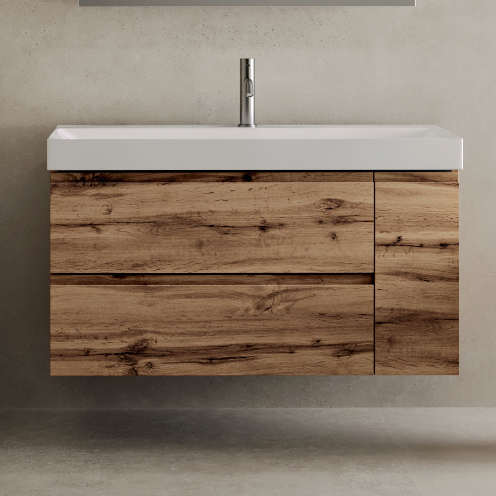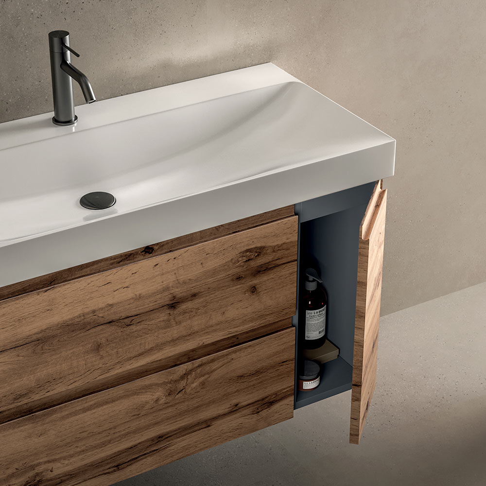 Le meuble bas, doté de deux tiroirs et d'une porte latérale, offre un rangement fonctionnel, alliant praticité au quotidien et esthétique épurée. Ses lignes nettes et sa conception suspendue allègent visuellement la salle de bains.