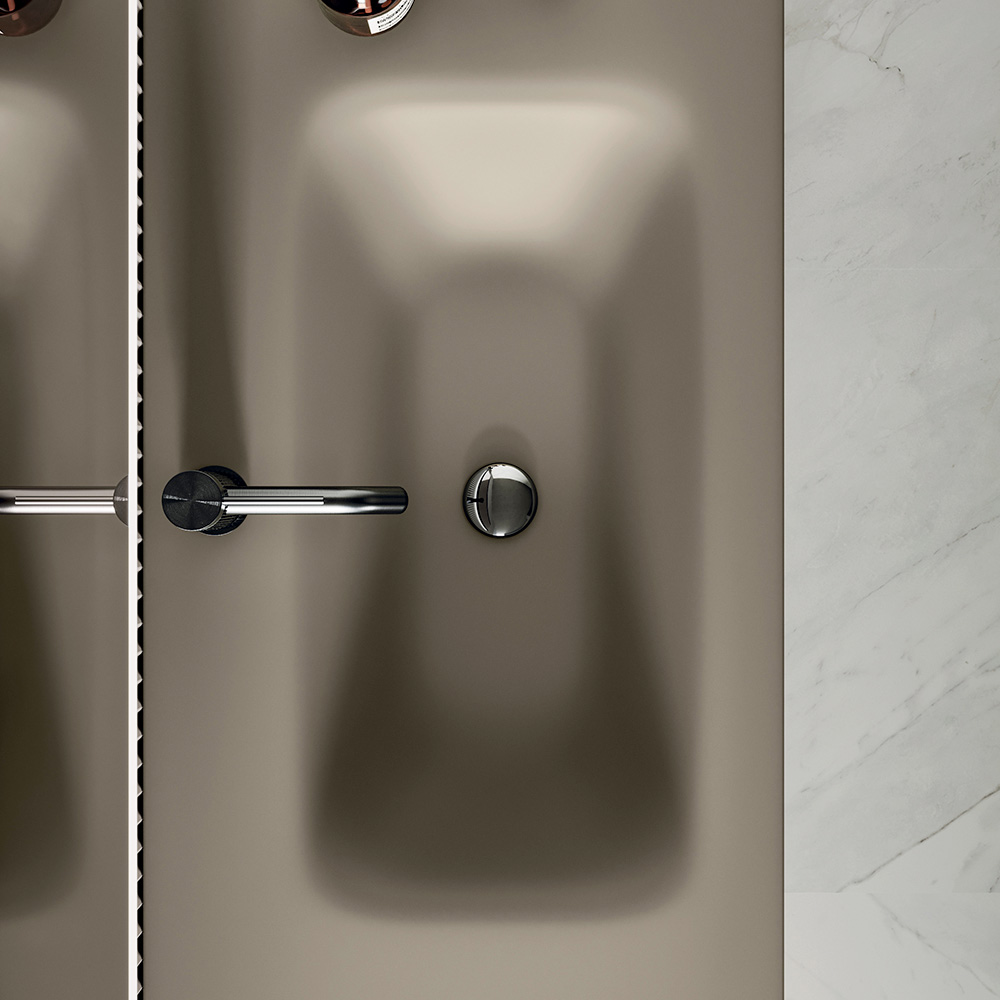 Le lavabo en verre satiné gris tourterelle crée un jeu de tons raffiné avec le socle, accentuant la légèreté visuelle de l'ensemble et apportant de la luminosité à la zone du lavabo.