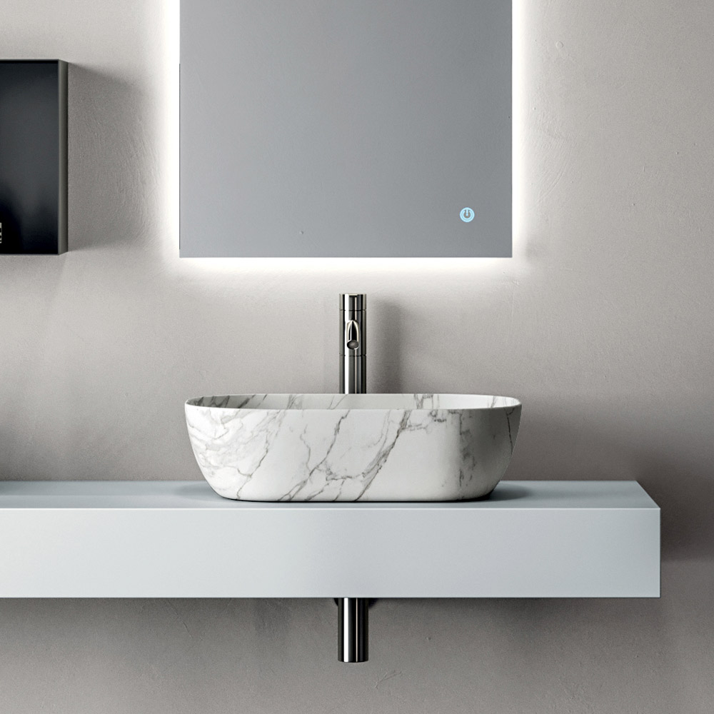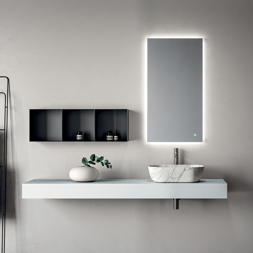 Le miroir rétroéclairé complète l'ensemble, offrant un éclairage fonctionnel et esthétique, idéal pour mettre en valeur le mur et agrandir visuellement l'espace.
