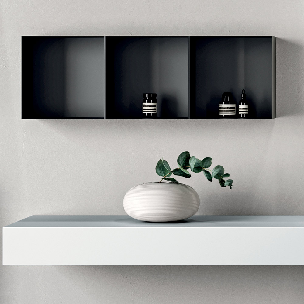 Les 3 éléments muraux en métal noir créent un contraste de couleurs élégant et ajoutent un espace de rangement vertical, rendant la composition dynamique et moderne.