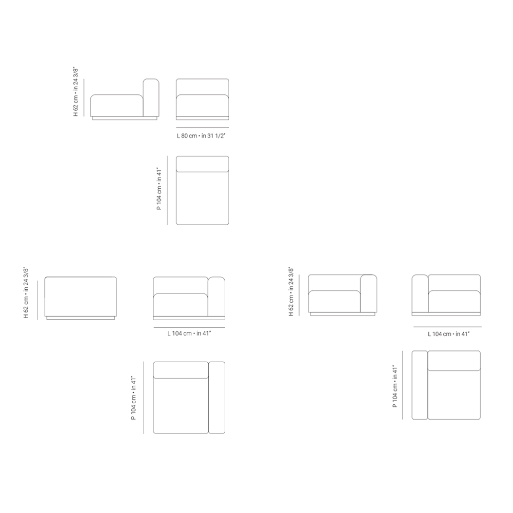 Taille totale du canapé : Dimensions de l'élément :- élément d'angle droit : L 104 x P 104 x H 62 cm