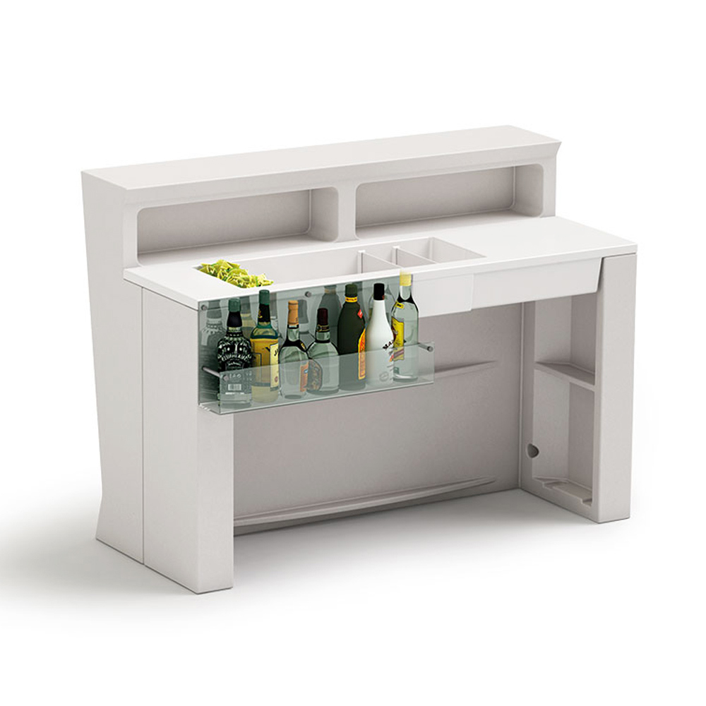 Comptoir de bar pour événements avec éclairage extérieur disponible avec LED blanche classique 36W ou LED RGBW 27W. Le comptoir s'adapte à tous les besoins de forme et d'espace, chaque jour et chaque soir. Il est parfait pour mettre en place des événements temporaires. Il est équipé d' un accessoire de rangement pour garder tout bien rangé et à portée de main sur votre comptoir de bar personnel. La station cocktail est conçue pour garantir la fonctionnalité et s’adapter à tous les besoins. Entièrement en polyéthylène blanc. Préparé pour le chargement de l'eau et avec séparateurs amovibles en plexiglas. Rotatif à 180° .