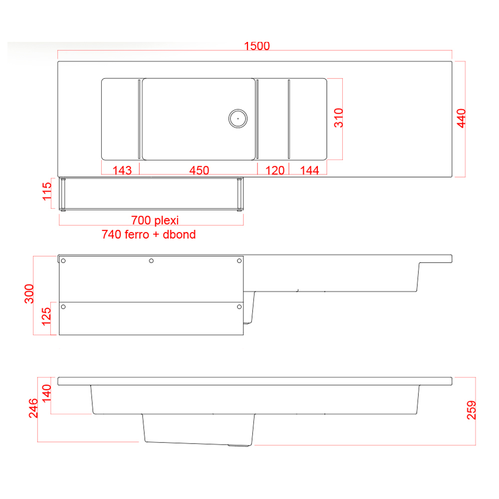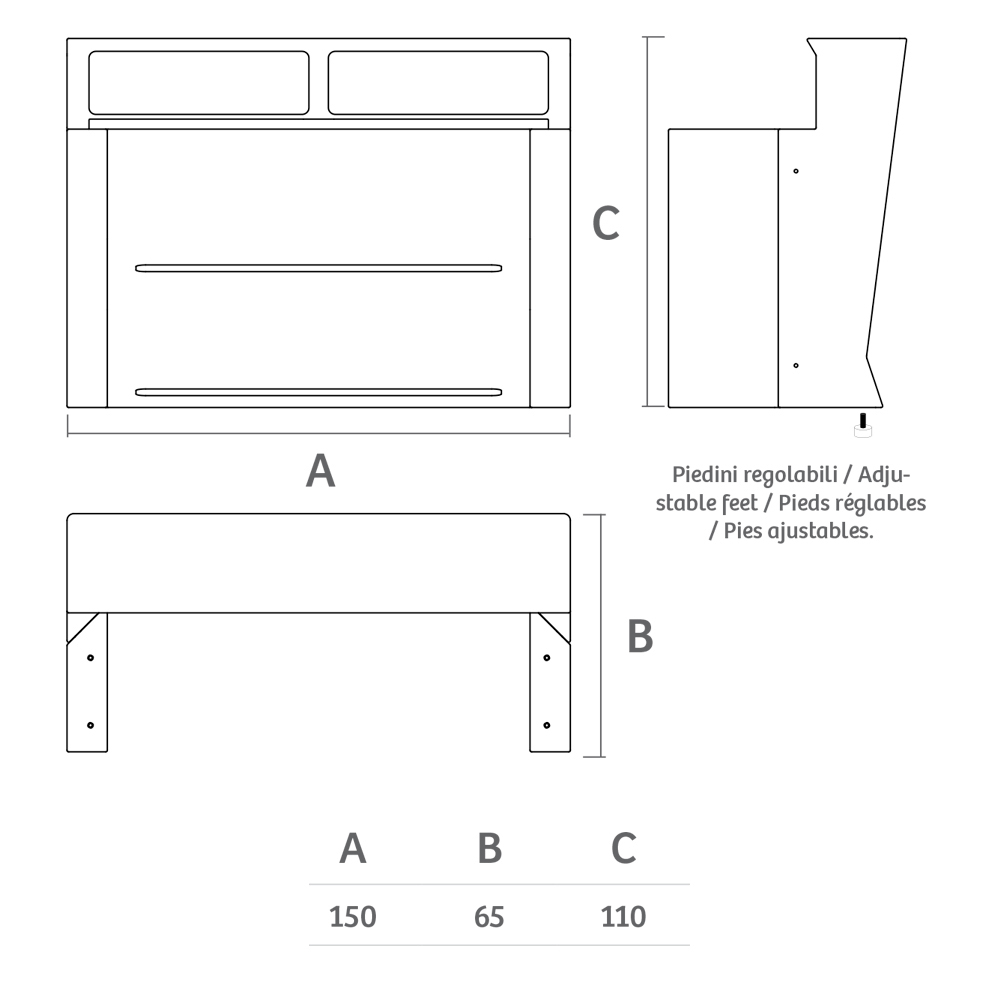 Comptoir : Hauteur 110 cm x Profondeur : 65 cm x Longueur : 150 cm