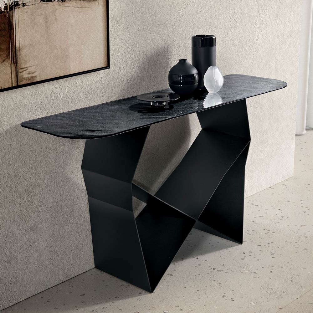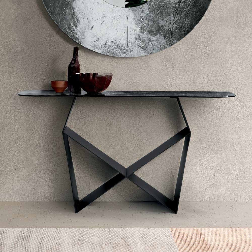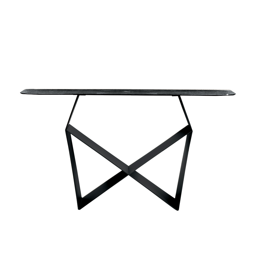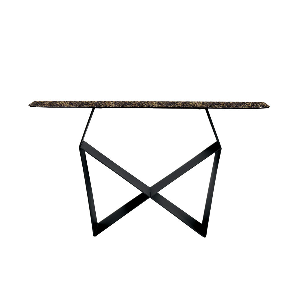 La structure se distingue par son socle en métal peint , qui dessine une forme originale de nœud papillon , créant un jeu subtil de pleins et de vides. Ce détail confère dynamisme et élan à la composition, donnant à la console une présence à la fois affirmée et équilibrée.