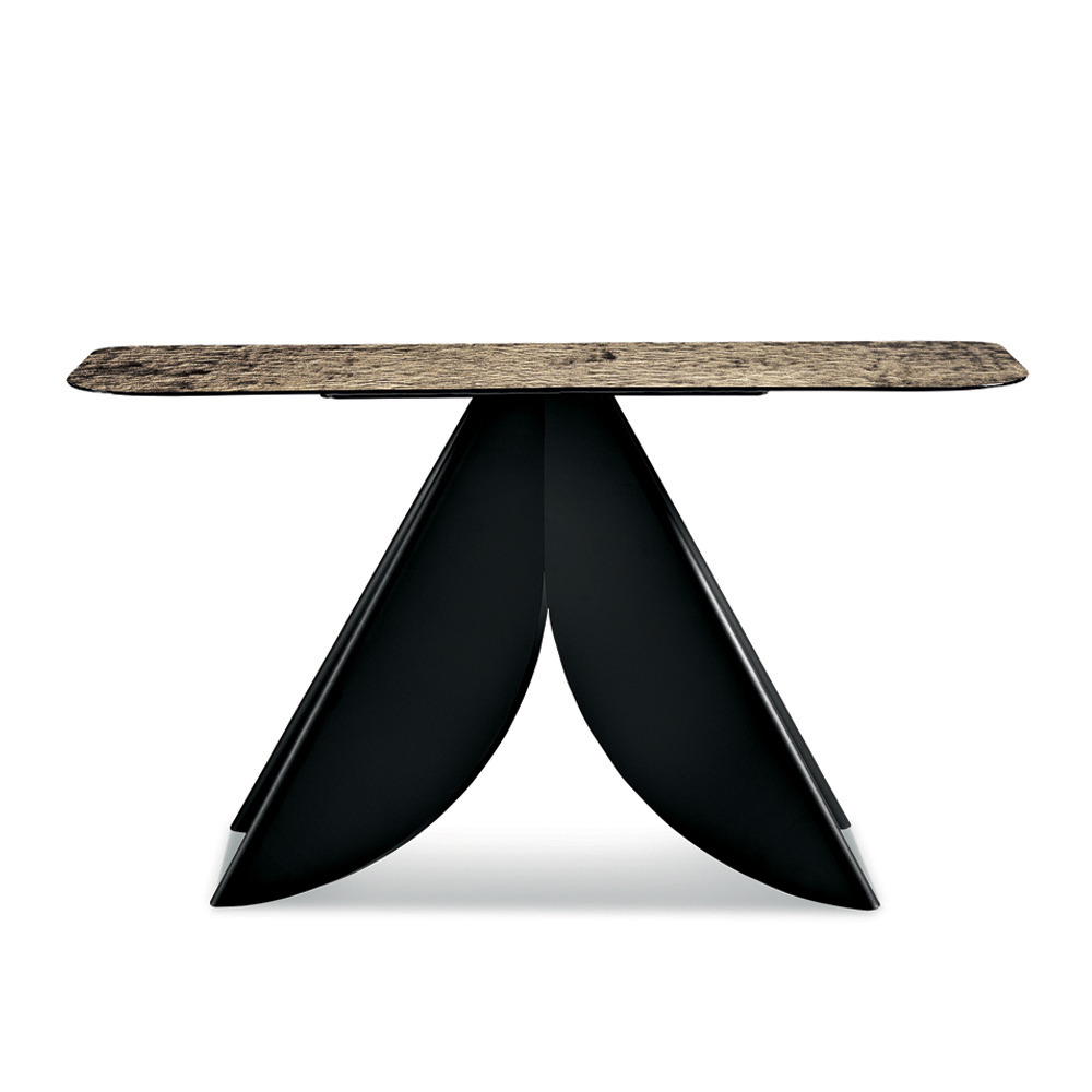 La structure se caractérise par un socle en métal peint composé de quatre éléments courbes entrelacés qui rappellent la forme des pétales, créant un effet graphique raffiné, dynamique et scénographique.