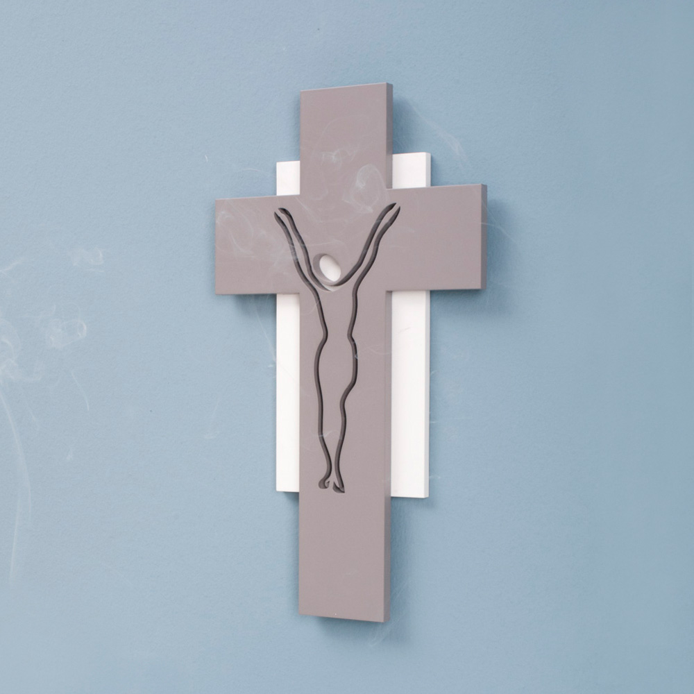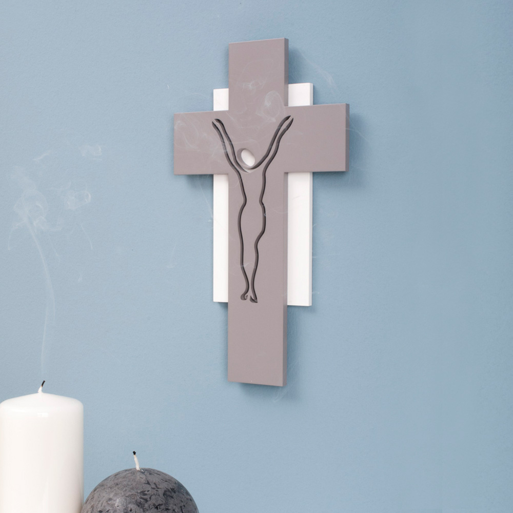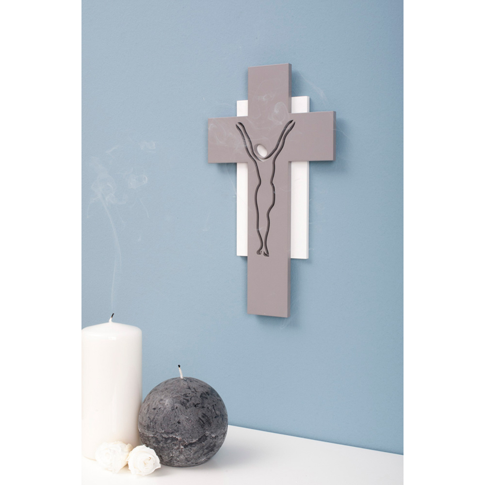 Crucifix en bois laqué gris avec silhouette découpée au laser du Christ crucifié en contraste avec un rectangle en bois laqué blanc .