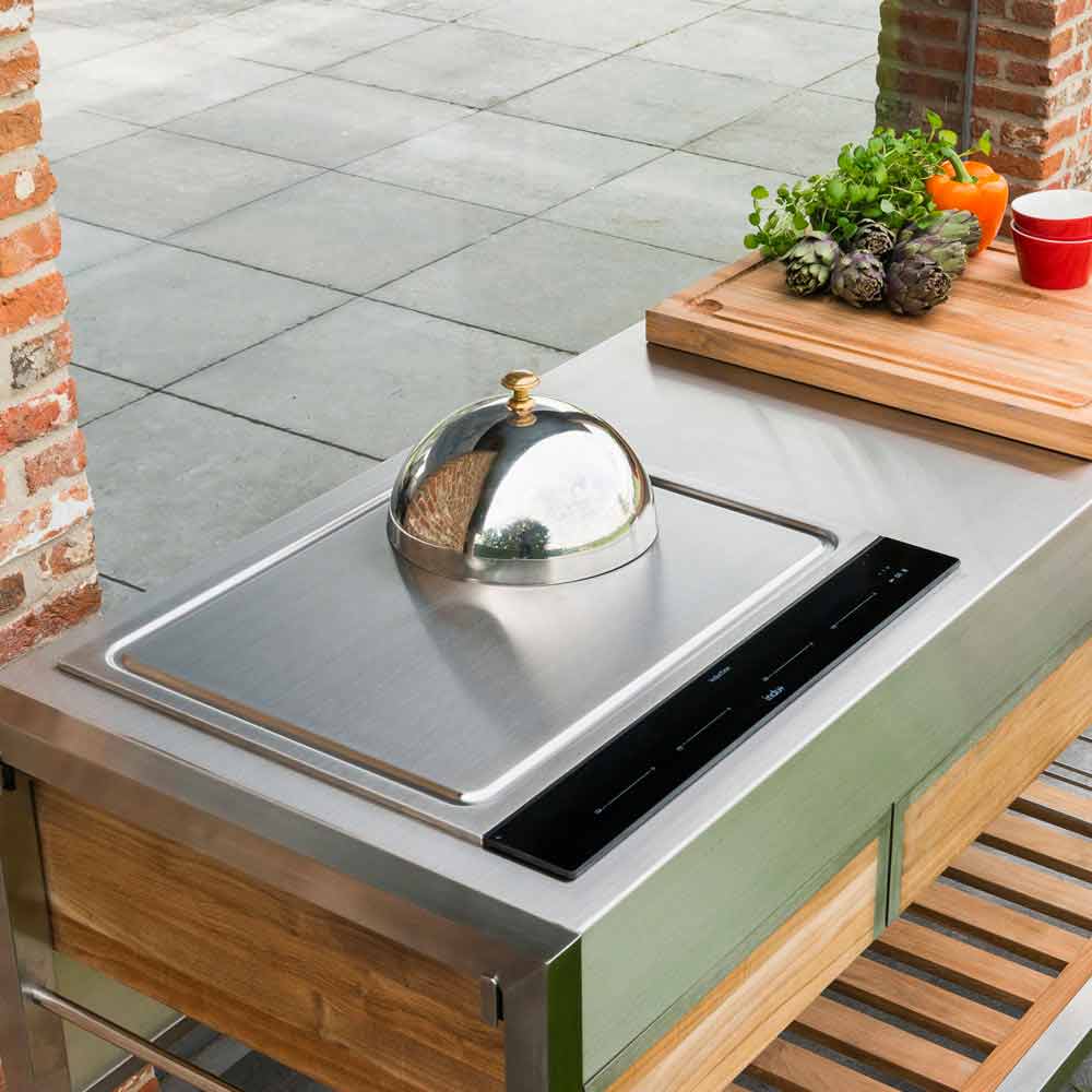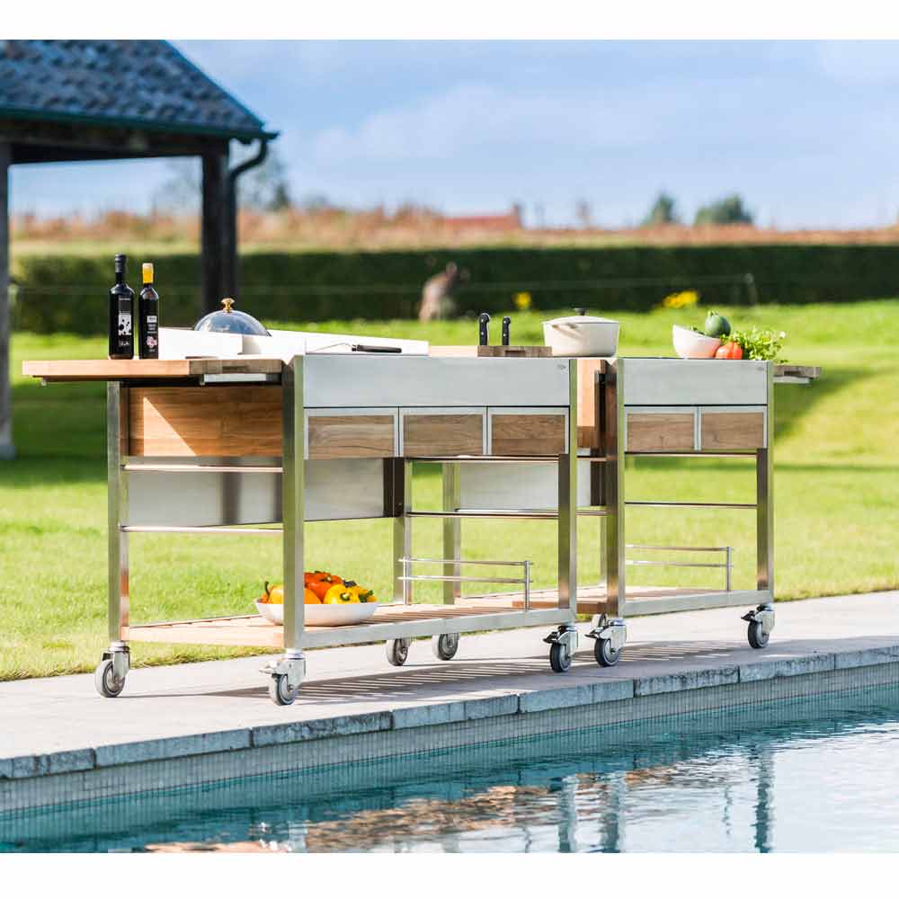Cuisine d'extérieur sur roulettes en acier inoxydable et bois de teck, deux tailles de design moderne avec plaques interchangeables.