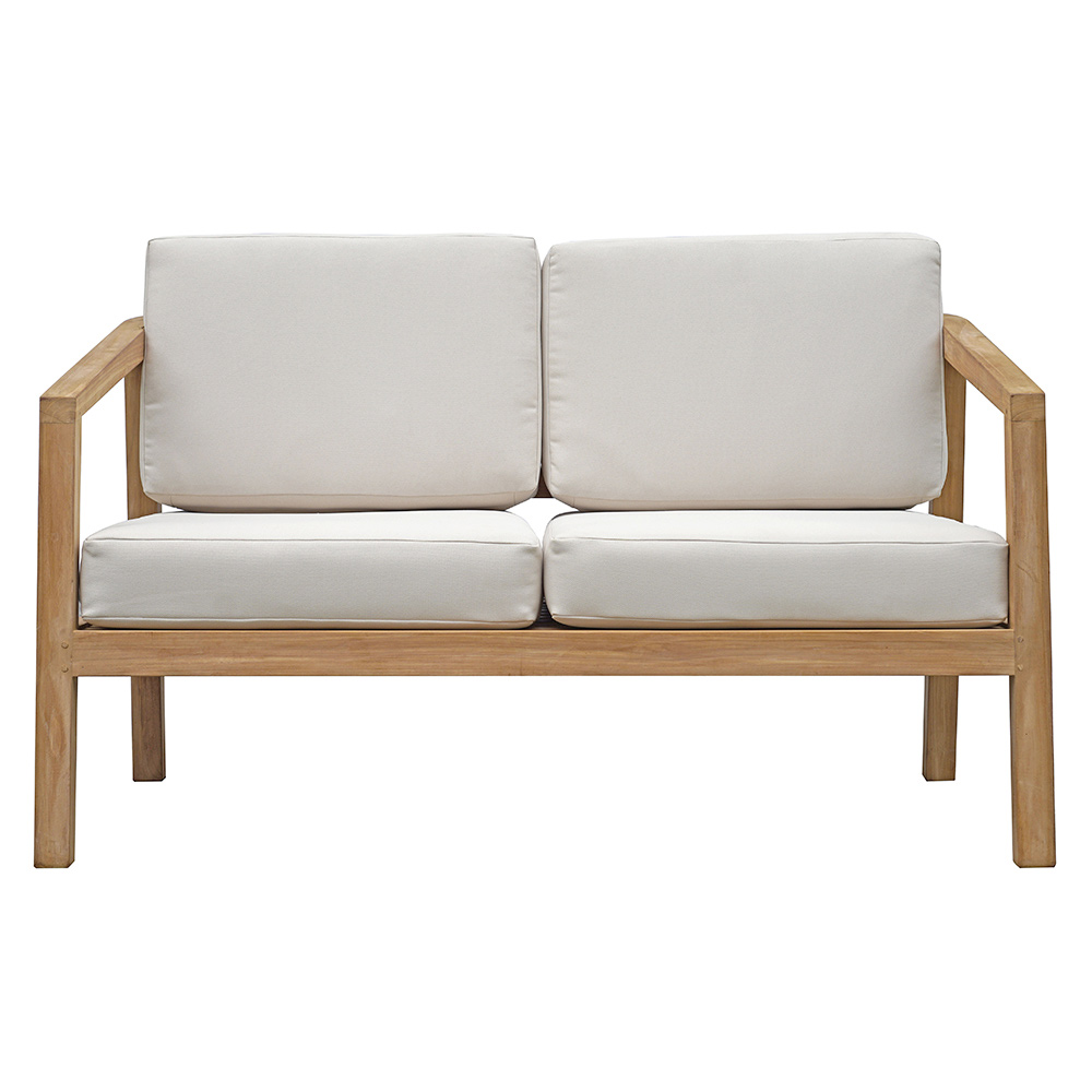 Son design épuré et harmonieux met en valeur la texture du bois, tandis que ses larges assises confortables en tissu écru font de cet ensemble l'idéal pour profiter de moments de pure détente en plein air.