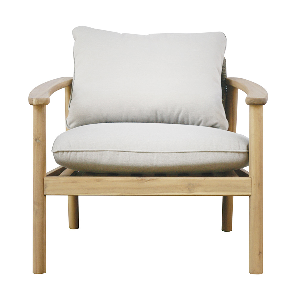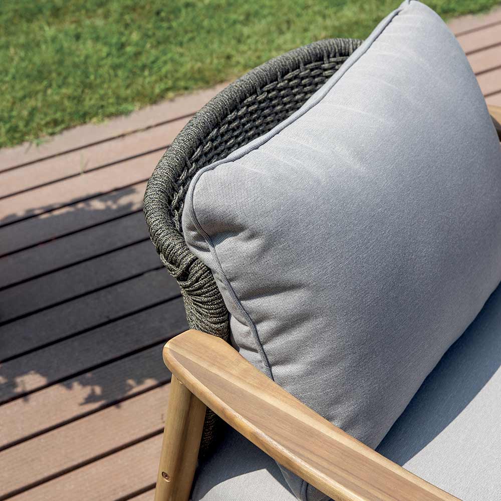 La structure en bois d'acacia confère solidité et chaleur, tandis que les détails en corde anthracite tressée apportent une touche moderne et sophistiquée. Les coussins gris amovibles garantissent un confort optimal et un entretien facile, préservant ainsi l'aspect raffiné et accueillant du salon au fil du temps.