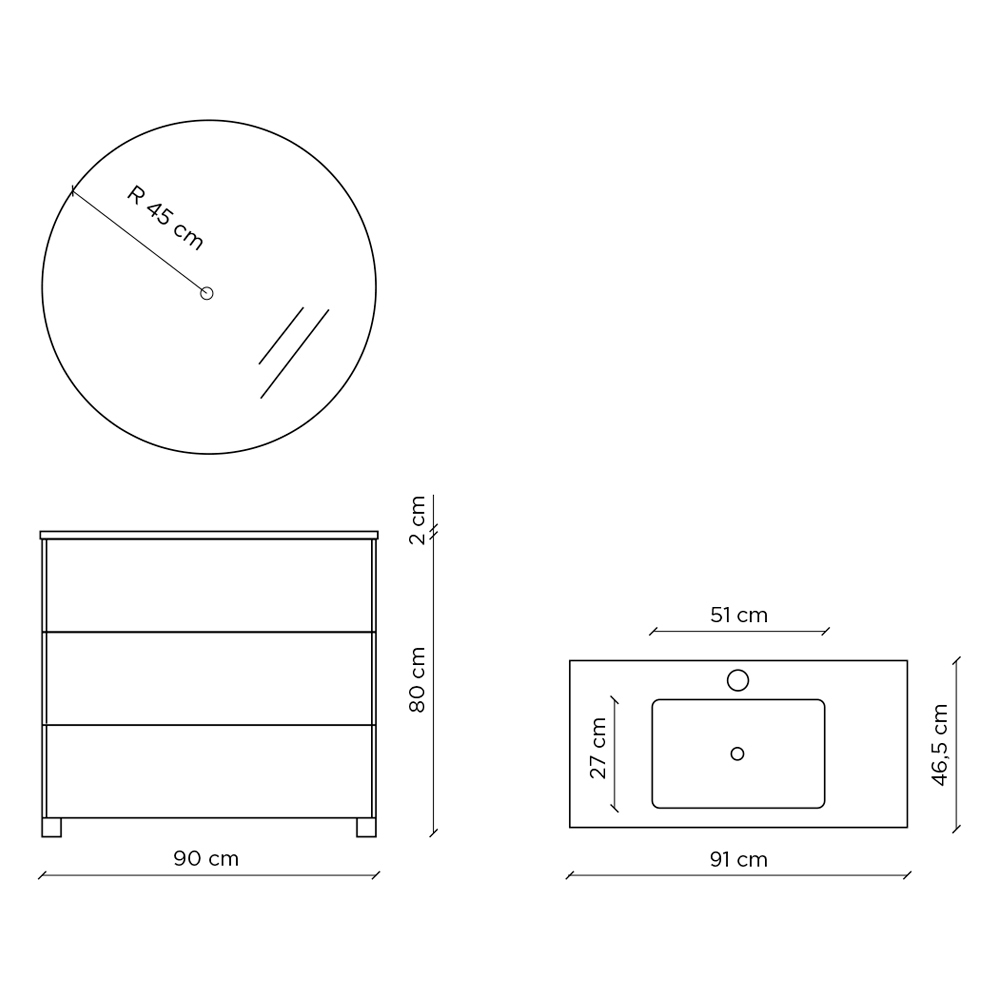 Dimensions: Vasque : L 51cm x P 27cm Piètement : L 90 cm x P 46,5 cm x H 82 cm Miroir : R 45cm