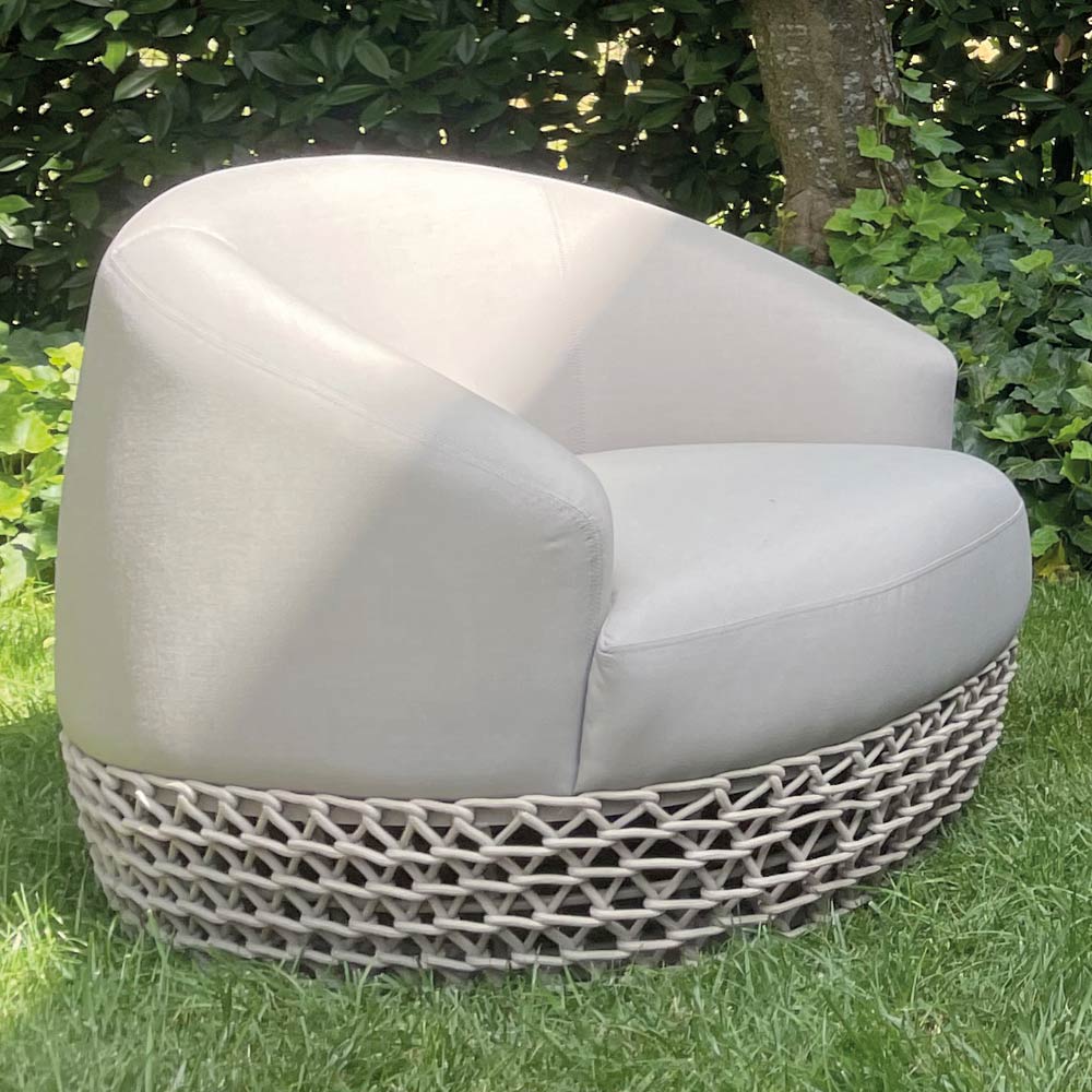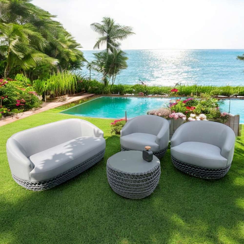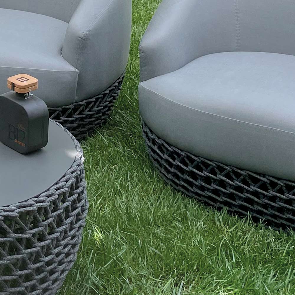 Les coussins, réalisés en caoutchouc extérieur imperméable , garantissent un confort maximal et une résistance impeccable aux agents atmosphériques, tandis que la structure en aluminium cachée à l'intérieur des sièges assure solidité et durabilité .