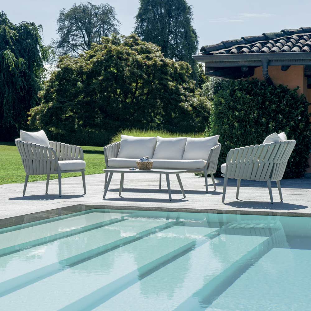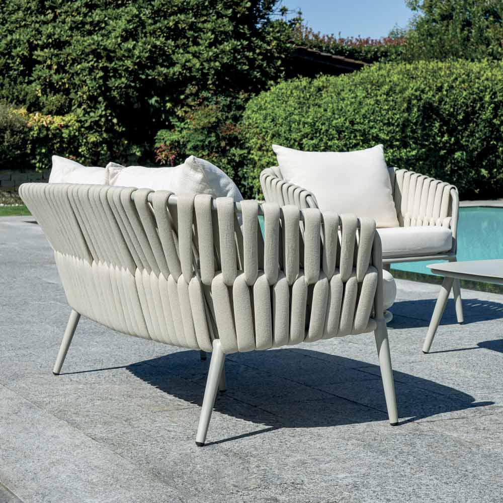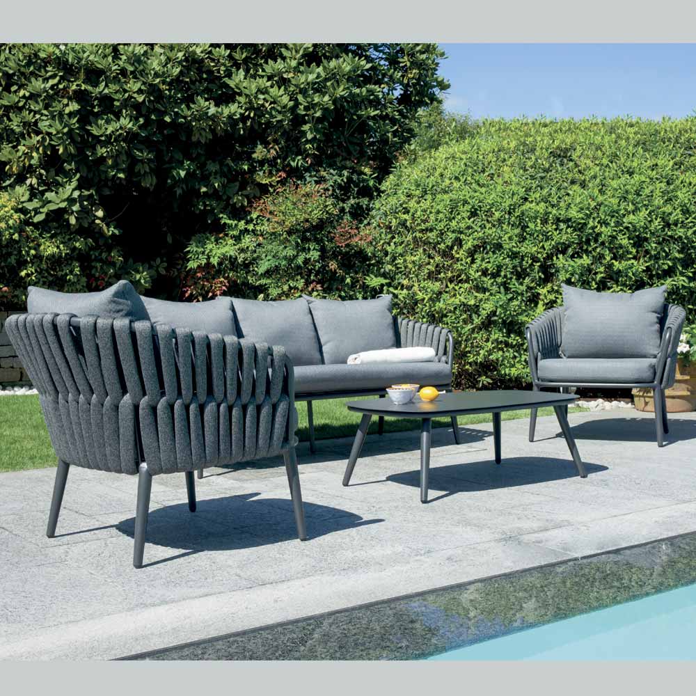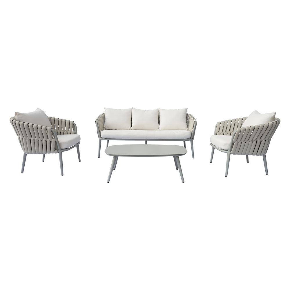 La structure en aluminium garantit légèreté et robustesse, tandis que le revêtement en corde rembourrée qui habille les assises et les dossiers apporte une touche à la fois contemporaine et confortable. Les housses de coussin amovibles assurent praticité et facilité d'entretien, préservant ainsi l'élégance et le raffinement du salon au fil du temps.