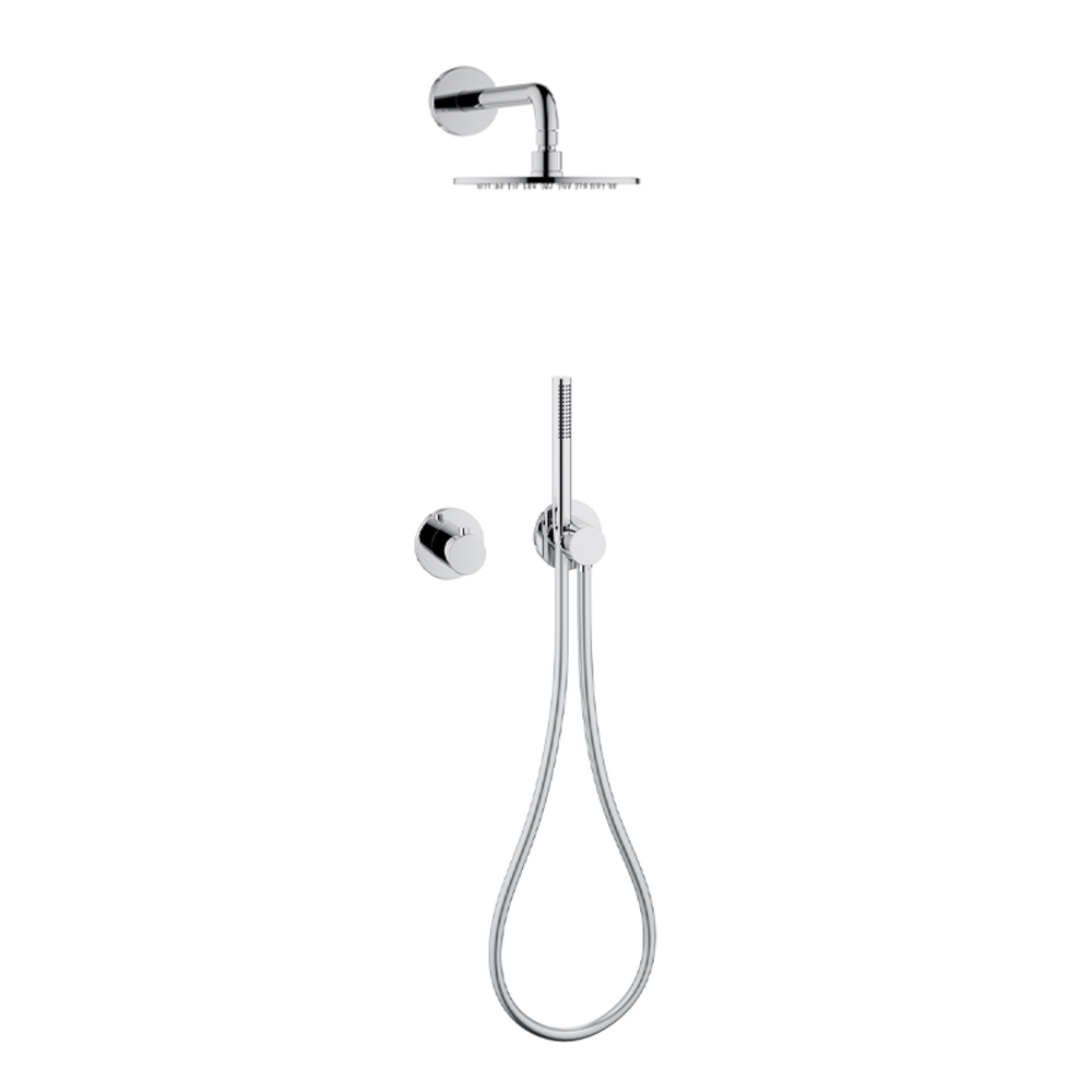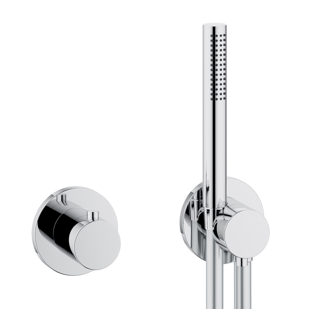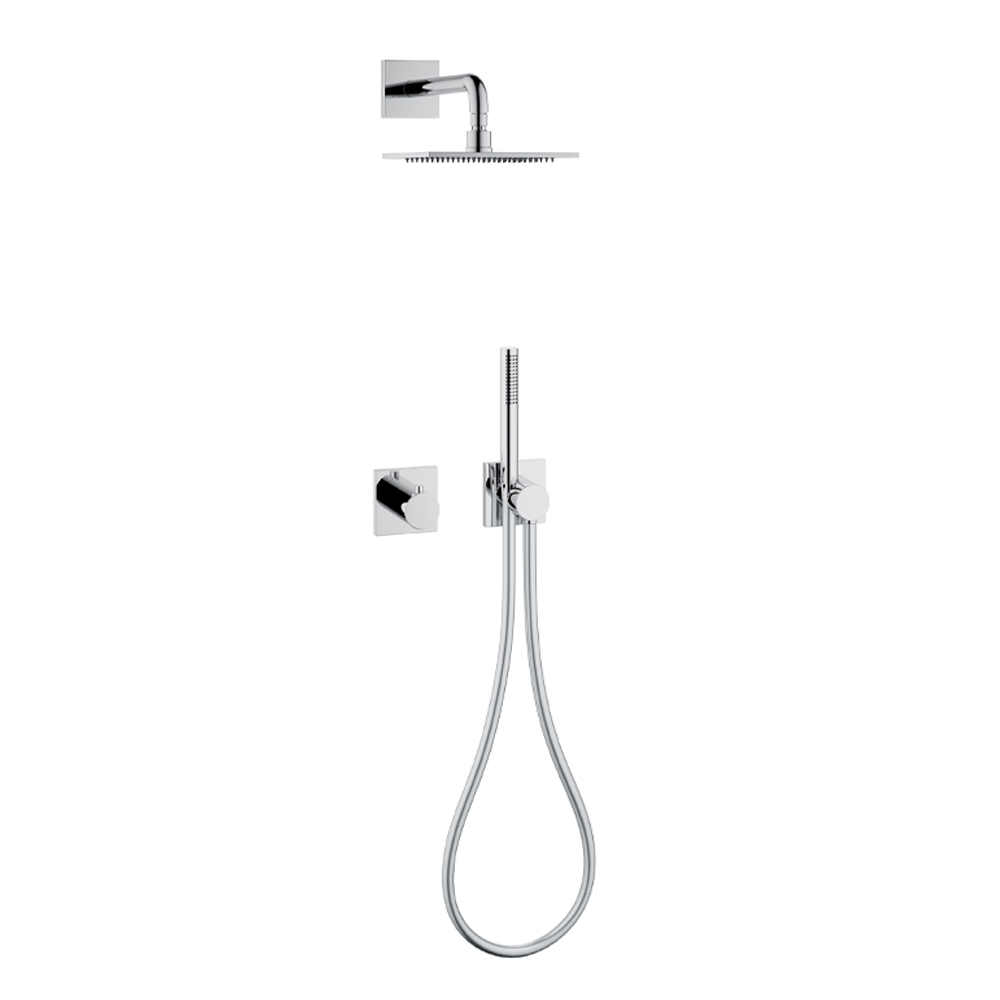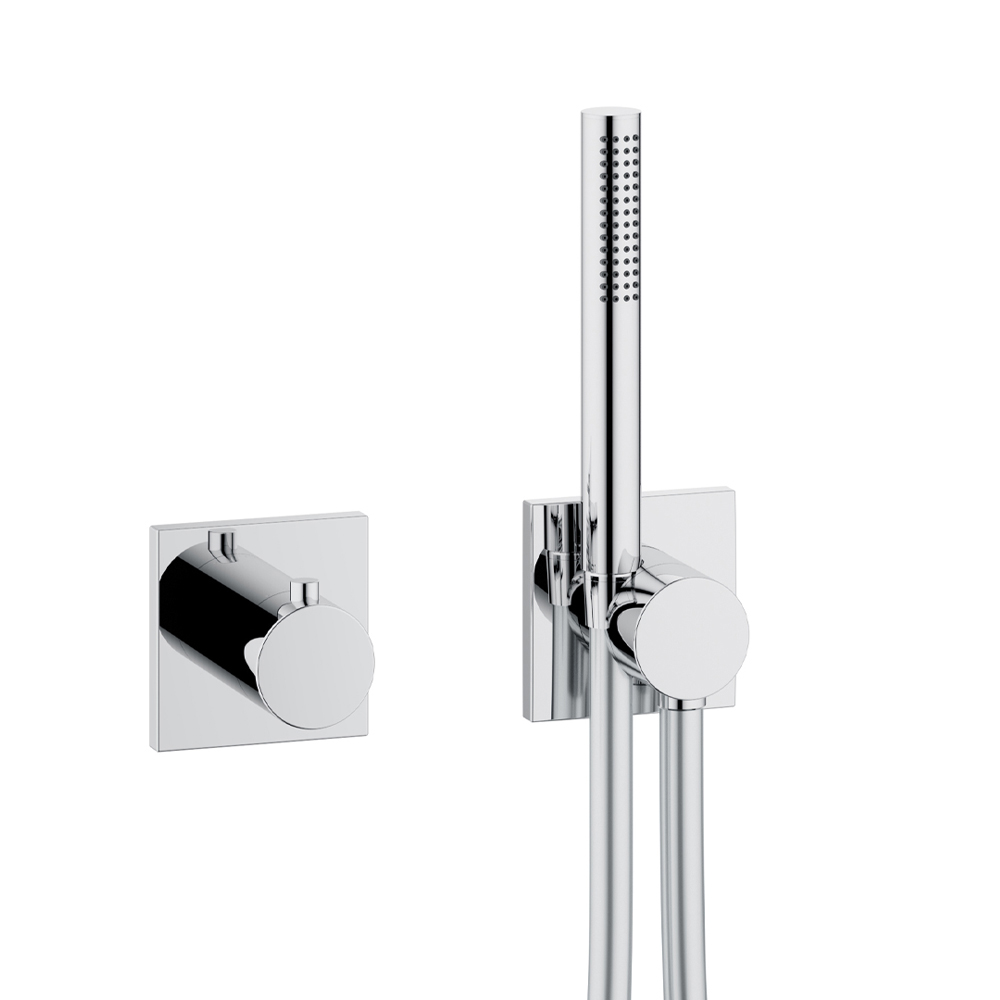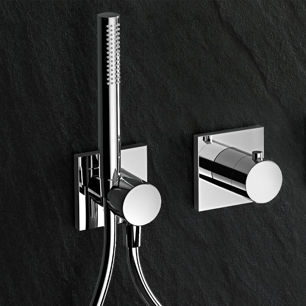 Cette cabine de douche intérieure à installation bidirectionnelle avec mitigeur monocommande, raccord de tuyau, support de douchette et pomme de douche a un design simple et minimal avec un choix de rosace ronde ou carrée et est entièrement réalisée en laiton chromé . Le résultat est un petit module caractérisé par un concentré intelligent de technologie innovante dans un design radical et minimaliste : le mélangeur et le raccord de tuyau sont connectés de manière unique pour un effort d'installation minimal et un confort fonctionnel maximal.