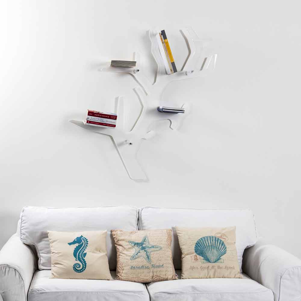 Sensations maritimes pour la bibliothèque murale Carol, réalisée avec des découpes laser précises pour lui donner la forme d'un véritable joyau de la mer. La partie avant en plexiglas transparent, qui reflète la partie arrière, disponible en blanc uni, donne une touche d'élégance à l'environnement domestique. La base transparente et l'étagère sont fabriquées en cristal acrylique PMMA 100 % polymère vierge. La luminosité et la brillance restent constantes et inchangées dans le temps. Le plexiglas polymère vierge PMMA utilisé est non toxique, hypoallergénique, inodore et antibactérien. 100% recyclable. Conforme à la norme UNI EN 71-3:200. Conçu, dessiné et fabriqué en Italie, avec des matériaux italiens.