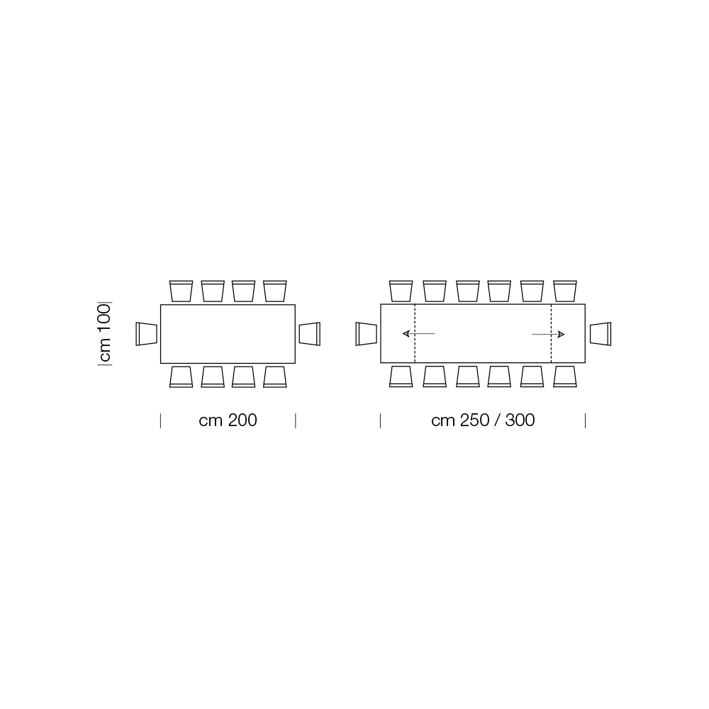 L 200 (300) x P 100 x H 75,8 cm 14 places extensibles avec deux rallonges extérieures de 50 cm chacune.