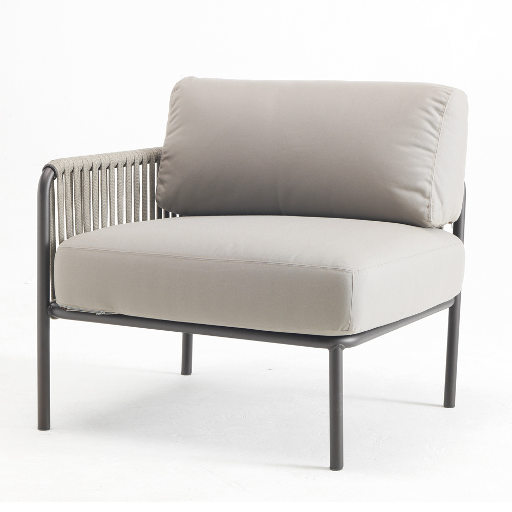 NB : Le fauteuil, la corde et les coussins sont disponibles dans une large gamme de coloris. L'accoudoir amovible peut être placé à droite ou à gauche.