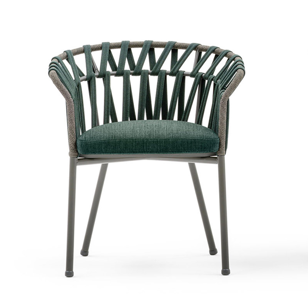 Fauteuil d'extérieur avec base en aluminium thermolaqué , assise amovible en tissu amovible et dossier en aluminium enrichi d'un entrelacement de cordons en tissu acrylique faits à la main . Son design s'inspire des formes élégantes et légères de la corolle d'une fleur et est rendu unique par le tissage créé selon un motif géométrique particulier qui épouse parfaitement les formes délicates et enveloppantes de la structure qui accueillent et détendent. Ce qui est né est une solution d'ameublement fraîche et innovante enrichie par les merveilleuses nuances raffinées grâce auxquelles le naturel extérieur se transforme en élégance contemporaine.