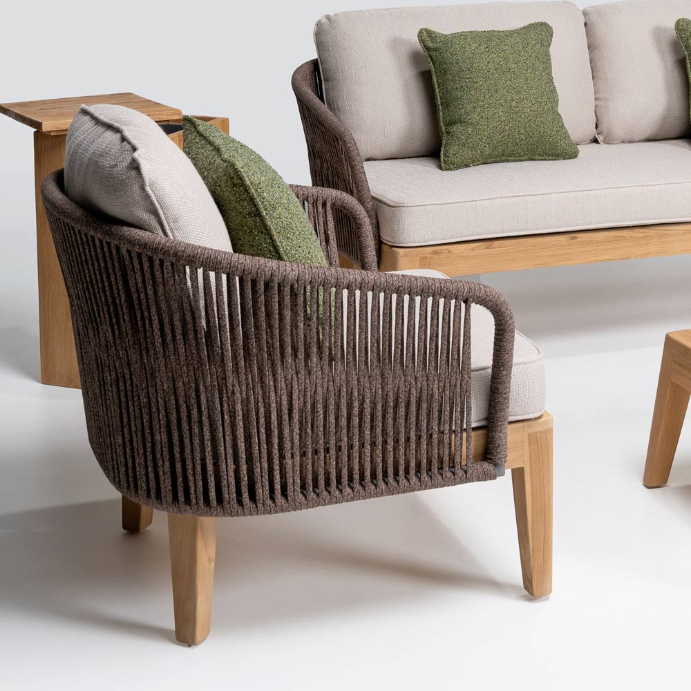 Fauteuil d'extérieur en teck et tressage polyéthylène avec coussins.