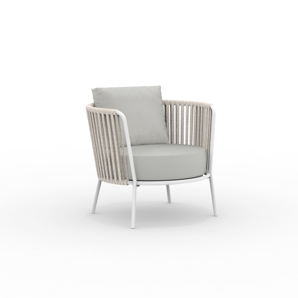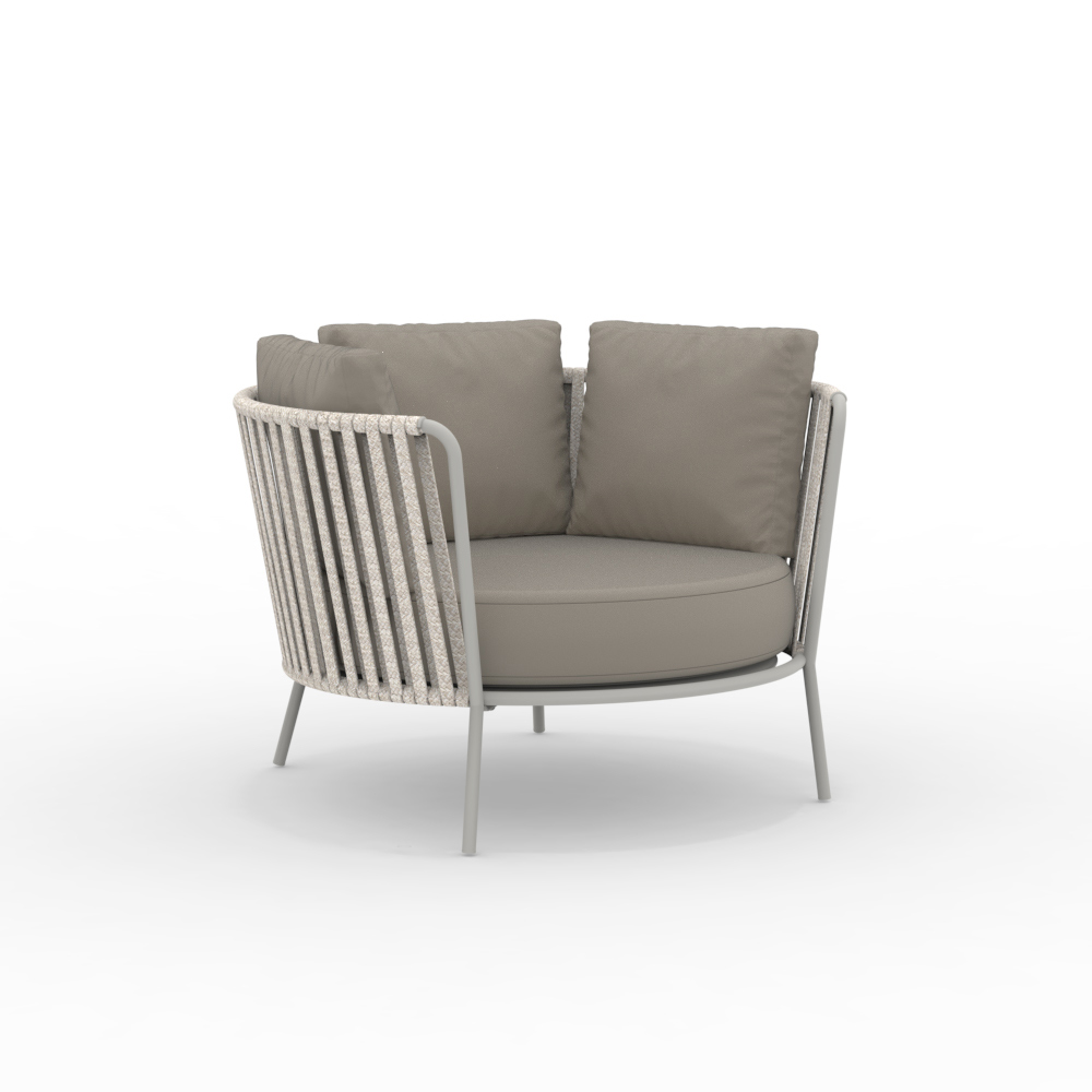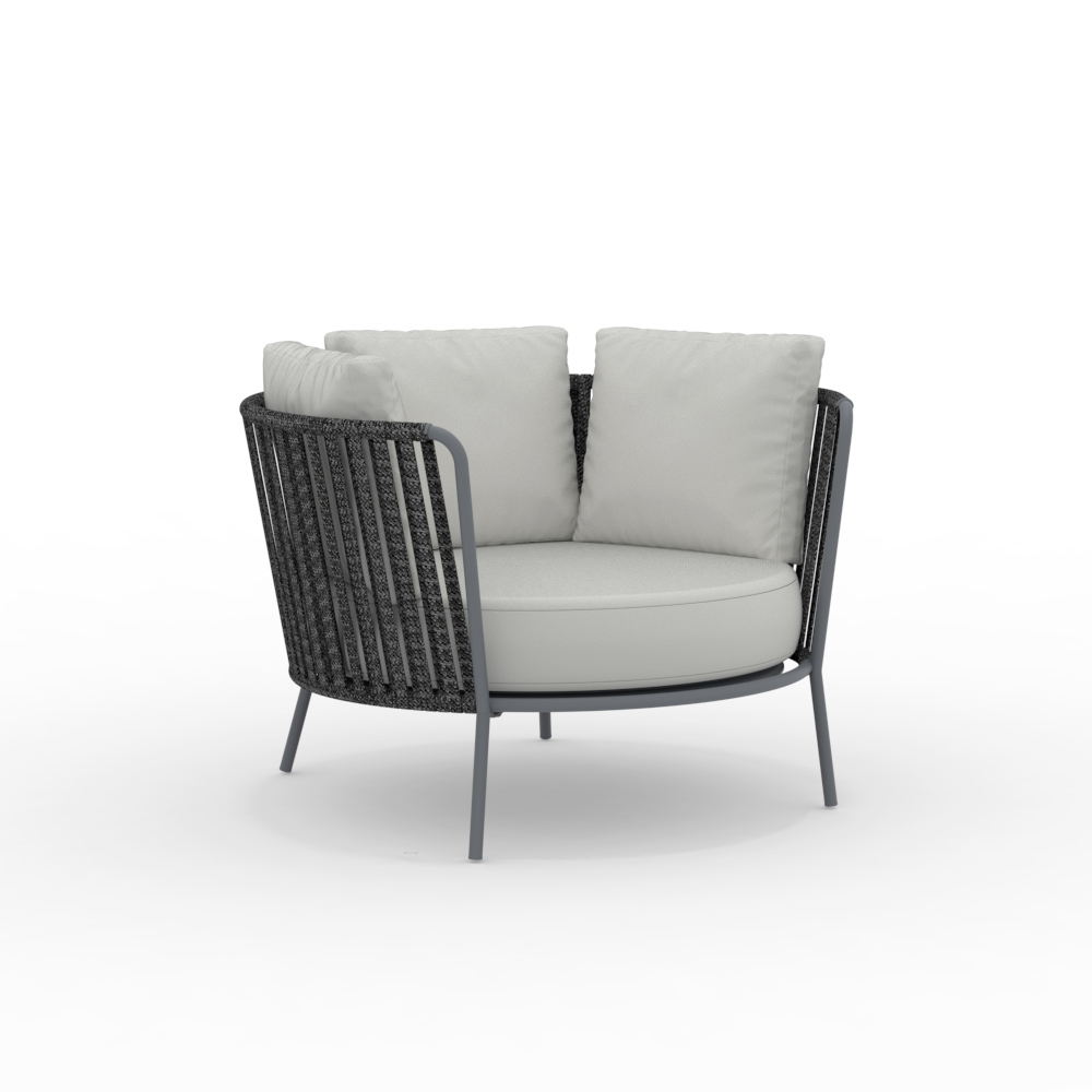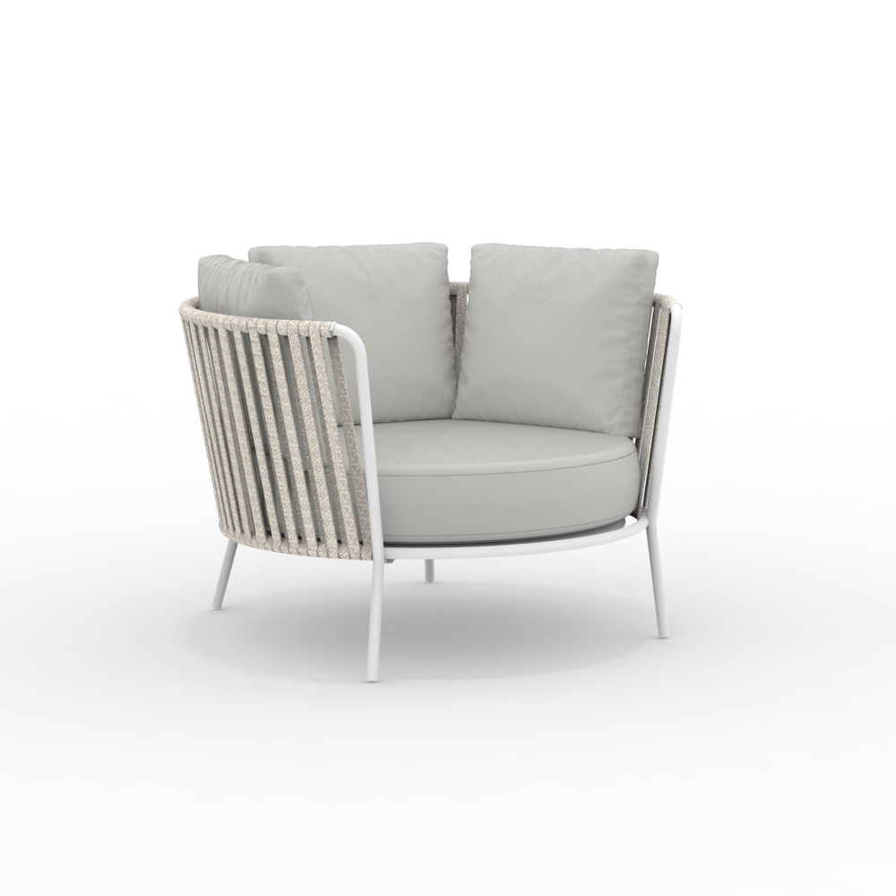 La structure en acier inoxydable garantit solidité et résistance aux intempéries, tandis que le tressage en corde apporte légèreté et raffinement, enveloppant l'assise d'un confort optimal. Son design ergonomique et ses lignes arrondies garantissent une assise agréable et relaxante.