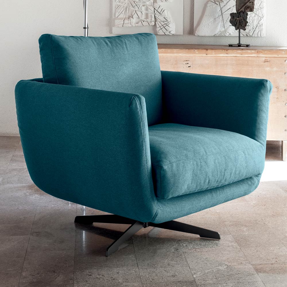 métal peint couleur anthracite. Le fauteuil représente une fusion harmonieuse entre confort et style moderne. Le design élégant aux lignes douces et arrondies évoque une sensation de confort, tandis que la structure robuste assure une durabilité dans le temps. Le revêtement en tissu de haute qualité, associé aux coussins larges et confortables, promet une expérience d'assise relaxante. Les pieds fins et géométriques ajoutent une touche sophistiquée, faisant du fauteuil une pièce de design fascinante. Ce fauteuil est idéal pour ceux qui recherchent une solution d'ameublement qui allie une esthétique moderne et un confort impeccable.