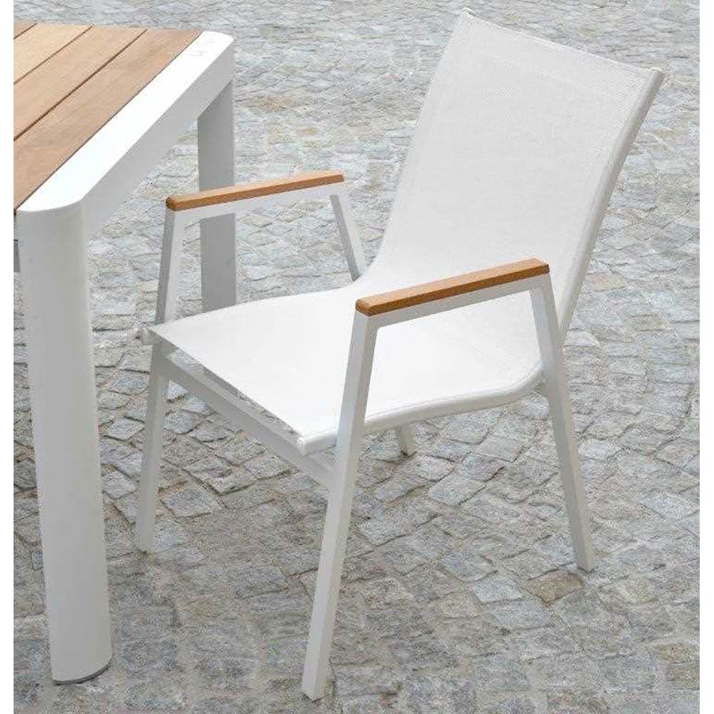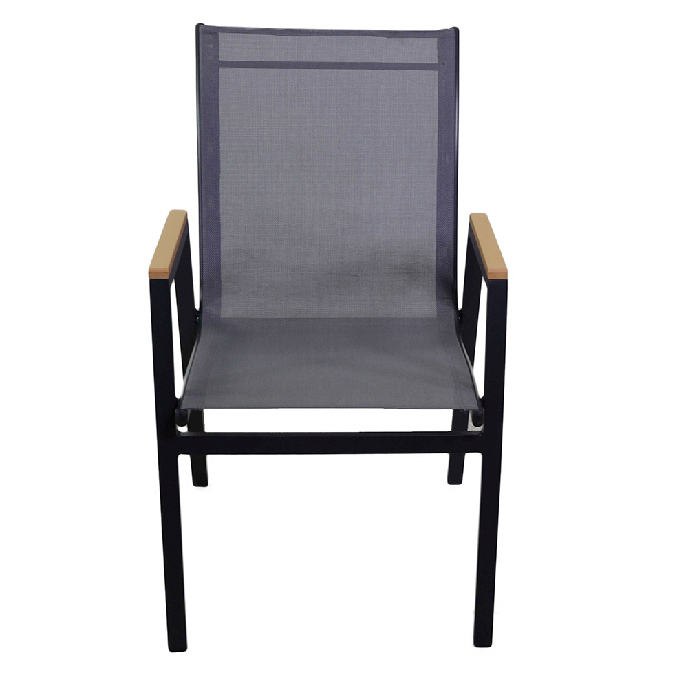 Ce bâti en aluminium fauteuil revêtu de poudre allie style et fonctionnalité, parfait pour compléter tout espace extérieur moderne. Le tissu textilene assure une résistance aux éléments et un confort durable, tandis que les inserts en bois sur les accoudoirs ajoutent une touche de chaleur et d'élégance.