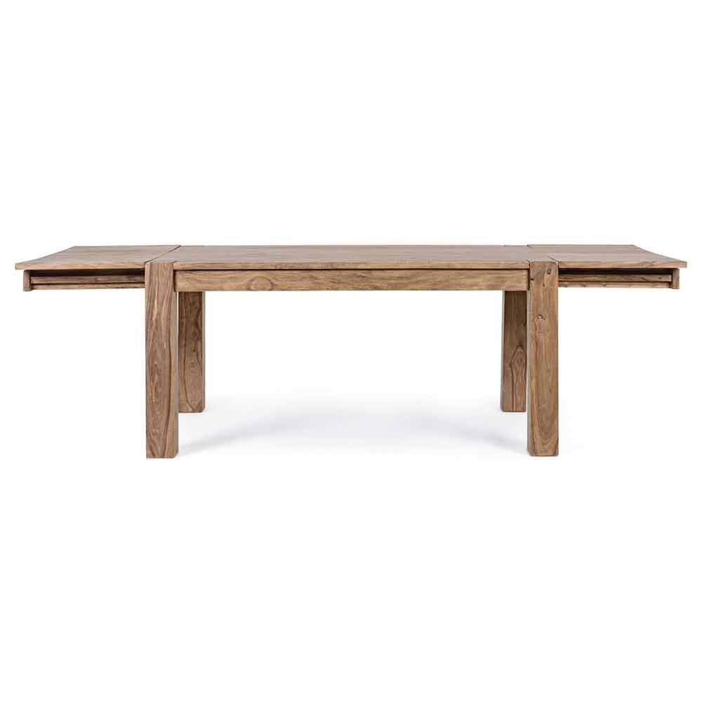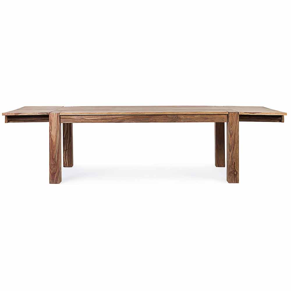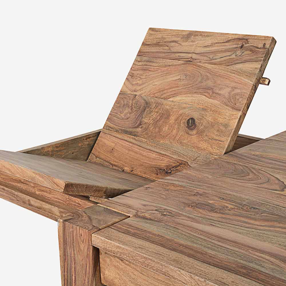 Bois de sheesham au fini naturel. Deux extensions intégrées avec ouverture papillon de 50 cm chacune. Jambes à assembler.