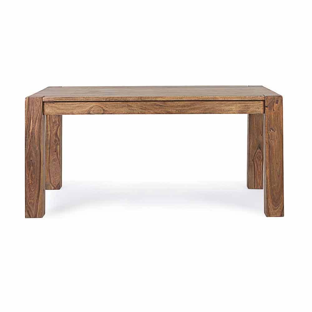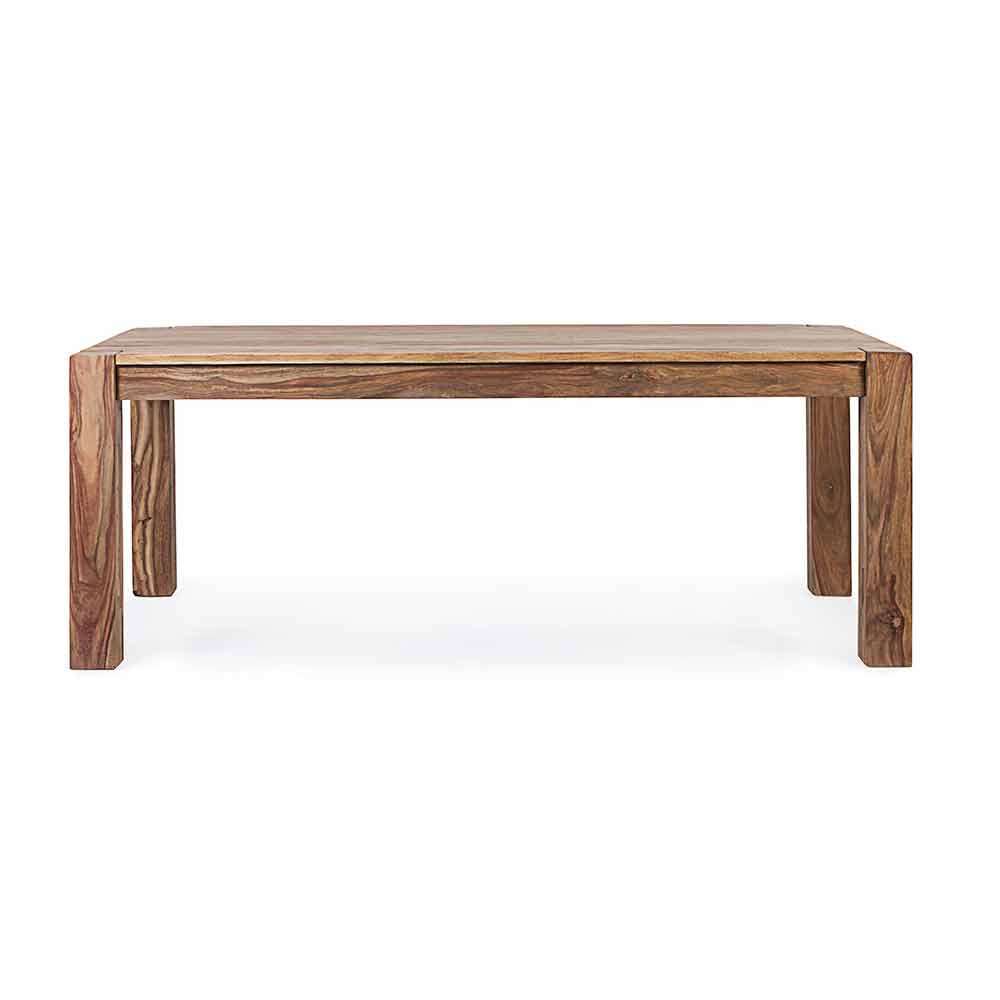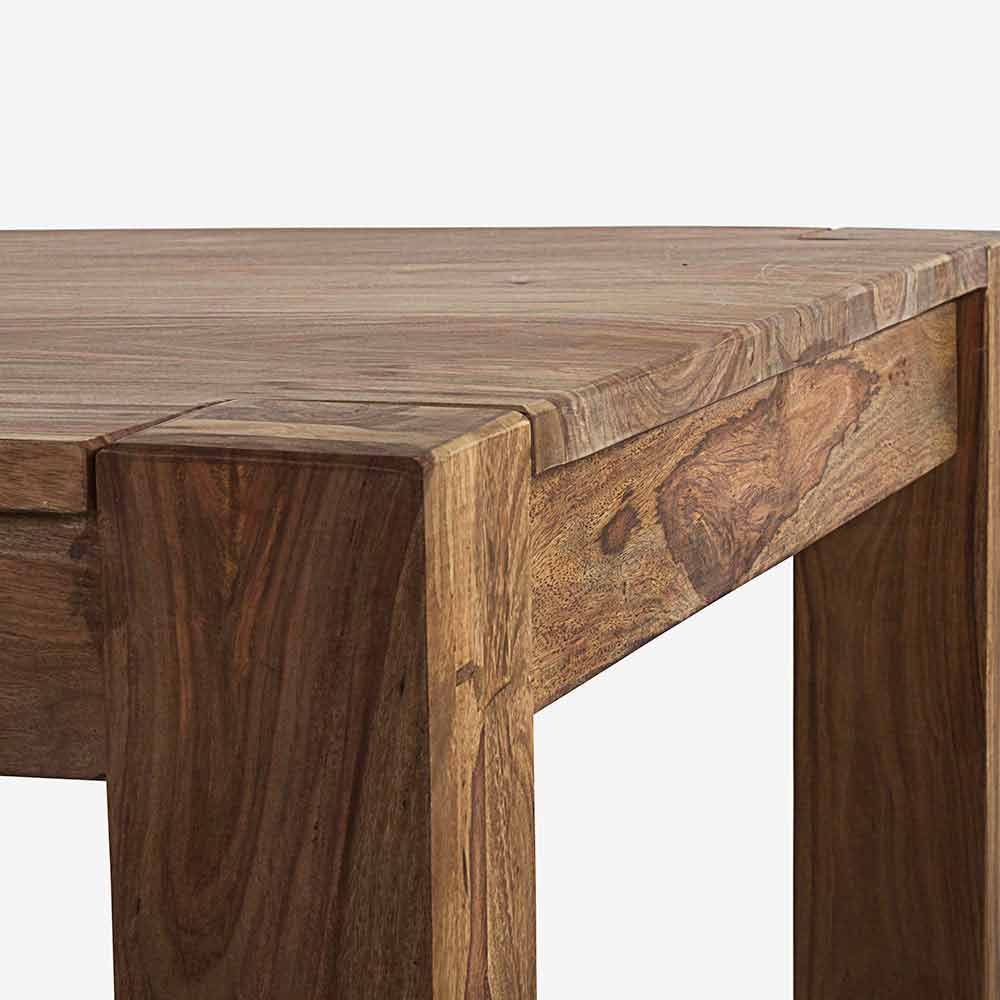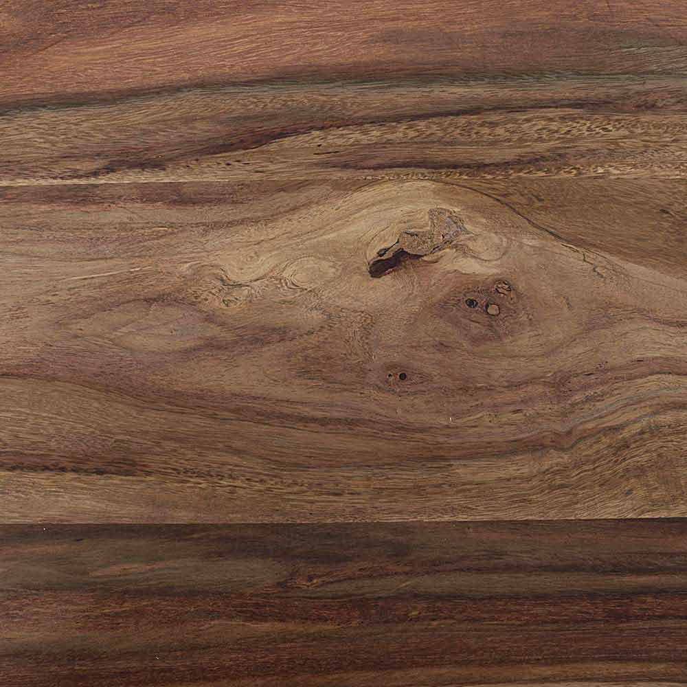 Bois de sheesham au fini naturel. Deux extensions intégrées avec ouverture papillon de 50 cm chacune. Jambes à assembler.