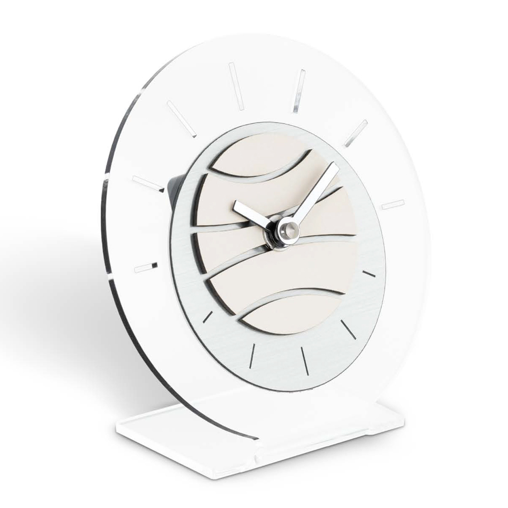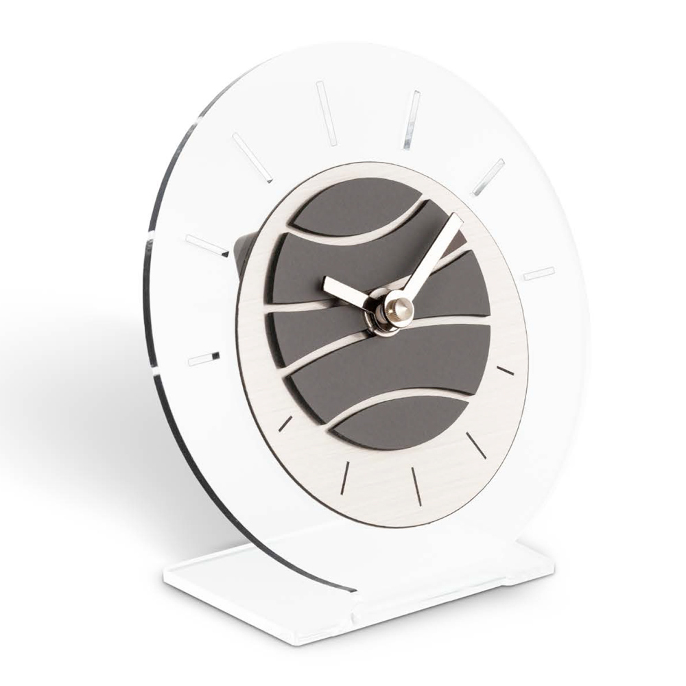 Cette horloge de table est un chef-d'œuvre de design moderne et d'innovation . Avec sa base stable et son cadran circulaire, il évoque une sensation de temps en suspension . Les aiguilles évoluent avec grâce sur un cadran qui joue sur l'alternance du vide et du plein, offrant une expérience visuelle dynamique et unique .