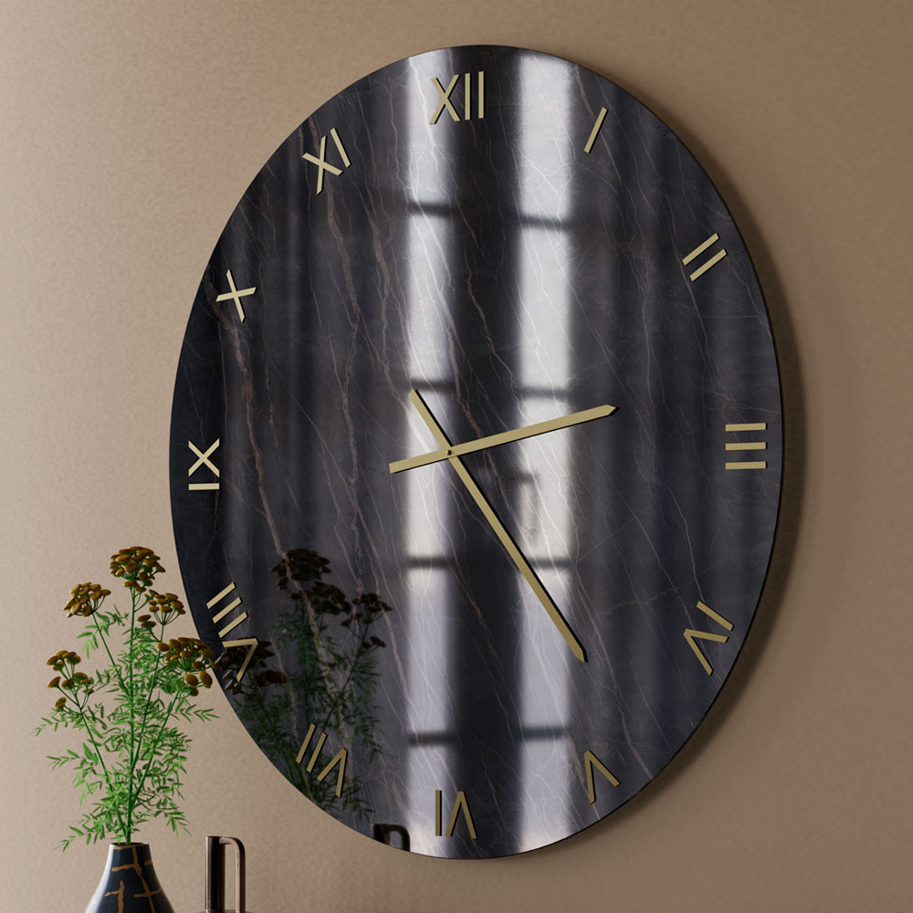 Cette horloge murale en verre, ornée d' une sérigraphie effet marbre Noir Or, est un accessoire de décoration audacieux, idéal pour les espaces élégants et contemporains. Son fond sombre, ponctué de veinures raffinées inspirées du marbre Noir Or, confère profondeur visuelle et caractère à la pièce.