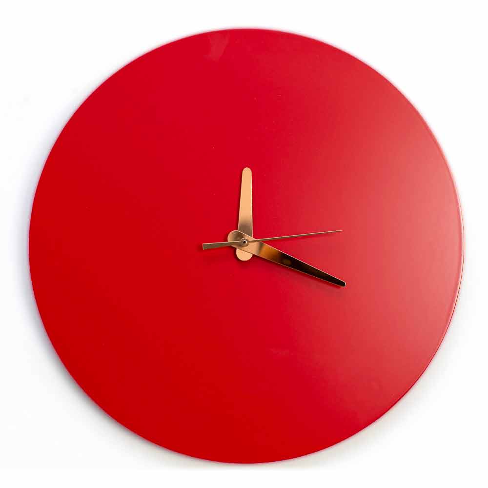 Horloge murale en bois laqué rouge et bronze, design rond et moderne, fabriquée en Italie.
