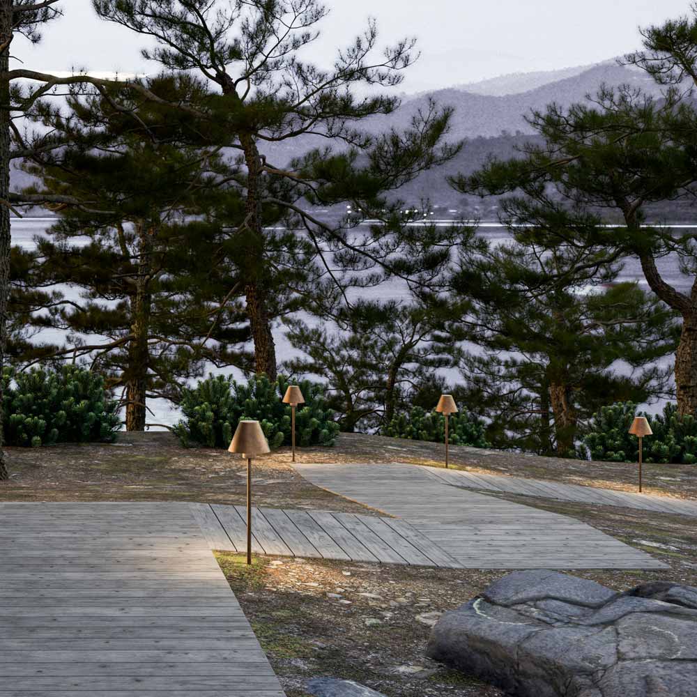La collection de lampes d'extérieur est née du désir d'apporter les caractéristiques du design d'intérieur aux produits destinés à l'extérieur, pour créer des atmosphères accueillantes et familières même en plein air. Avec des lignes inspirées de l'esthétique nordique, les lampadaires ou appliques sont réalisées en laiton et en cuivre.