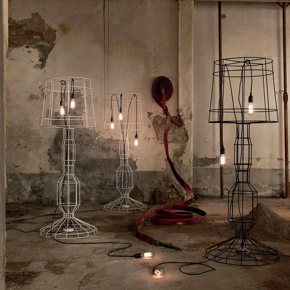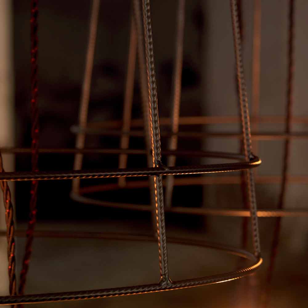 La lampe est faite de tige métallique nervurée en deux finitions pour un design entièrement italien qui, grâce à une expérimentation non conventionnelle et une recherche continue entre tradition et modernité , est capable d'étonner, d'oser et d'exciter, vous permettant d'exprimer vos émotions à travers une décoration originale et personnelle. utilisation de la lumière.