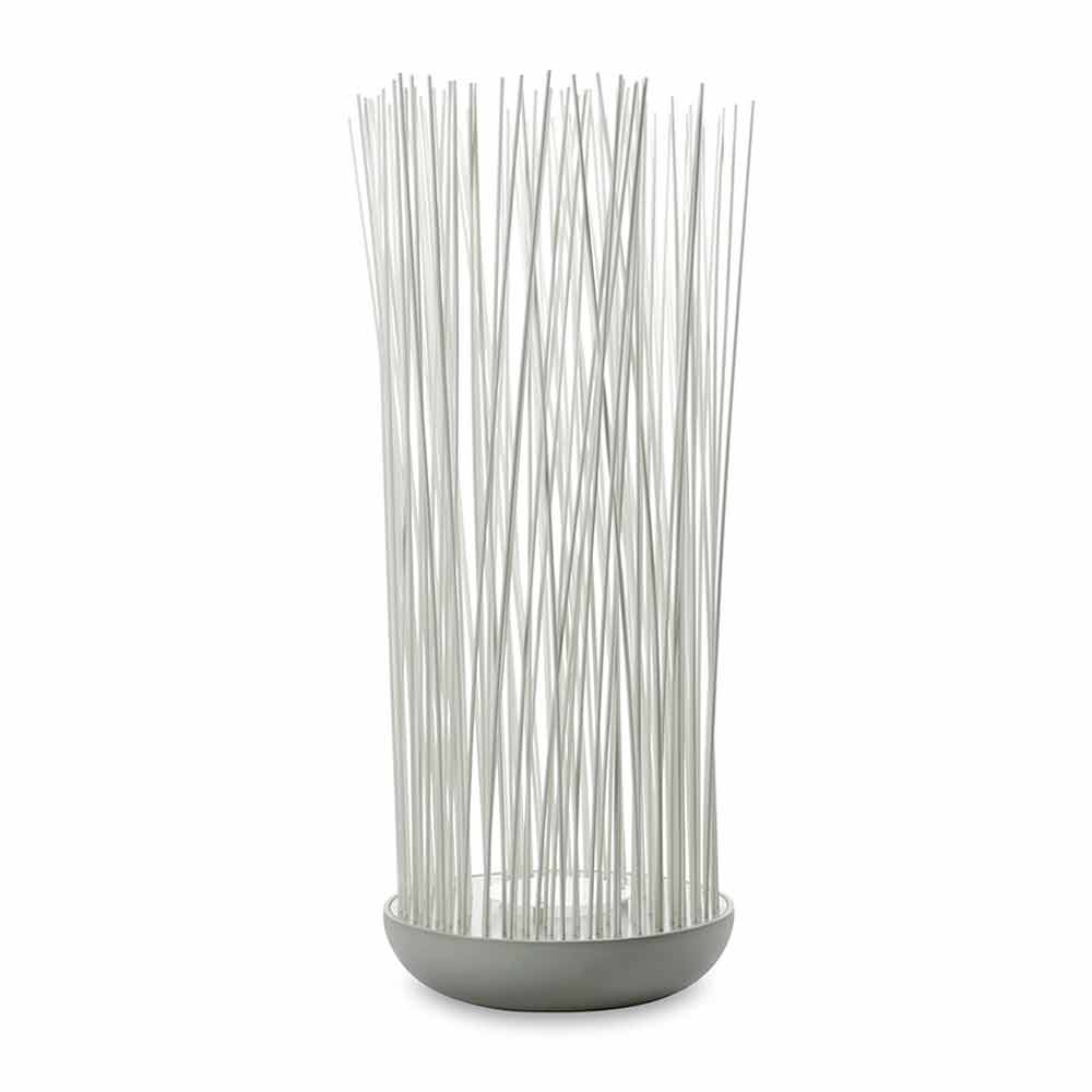 La lampe est composée de technopolymère gris mat et de tiges en PVC blanc mat.