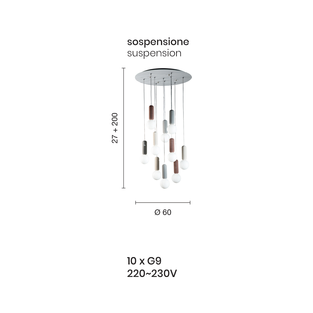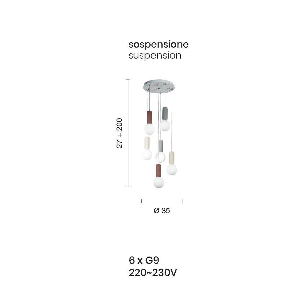6 lumières - diamètre 35 x H 227 cm (6x G9 220-230V) ;