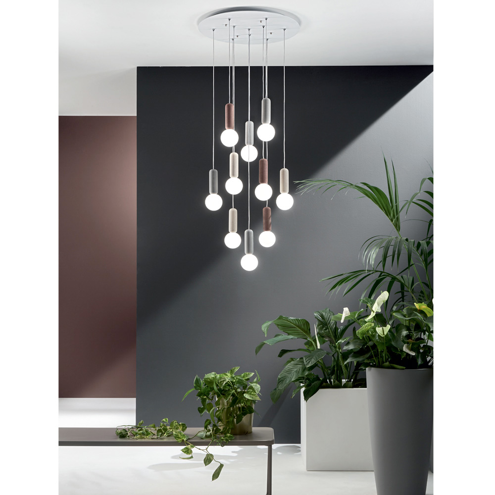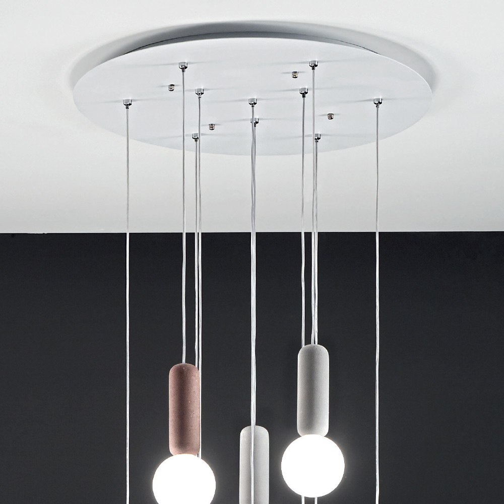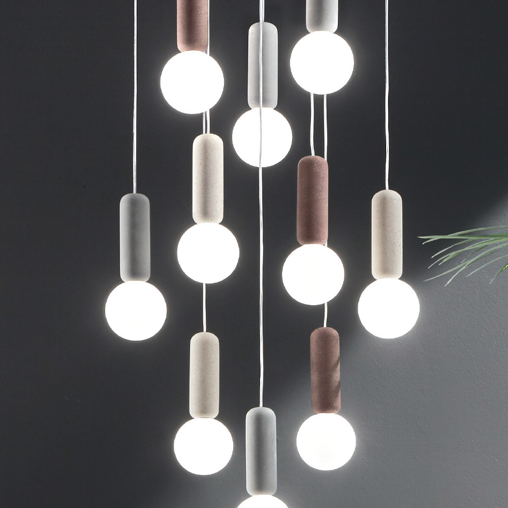 Lampe suspendue à 6 ou 10 lumières avec structure en béton et abat-jour ronds en verre satiné blanc avec câbles réglables en longueur. Une combinaison inhabituelle et créative de matériaux et de finitions qui donne vie à une solution d'ameublement aussi excentrique qu'élégante et moderne. Les merveilleuses nuances de couleurs choisies pour les éléments en béton se marient parfaitement avec la finition délicate et romantique des abat-jour en verre pour un résultat à l' esthétique sophistiquée et à fort impact visuel . Sa conformation qui se développe sur un design vertical en fait une idée d'ameublement parfaite pour éclairer les salles à manger, les salons, les cuisines ou les chambres avec un goût contemporain, donnant à l'environnement une touche de style unique .