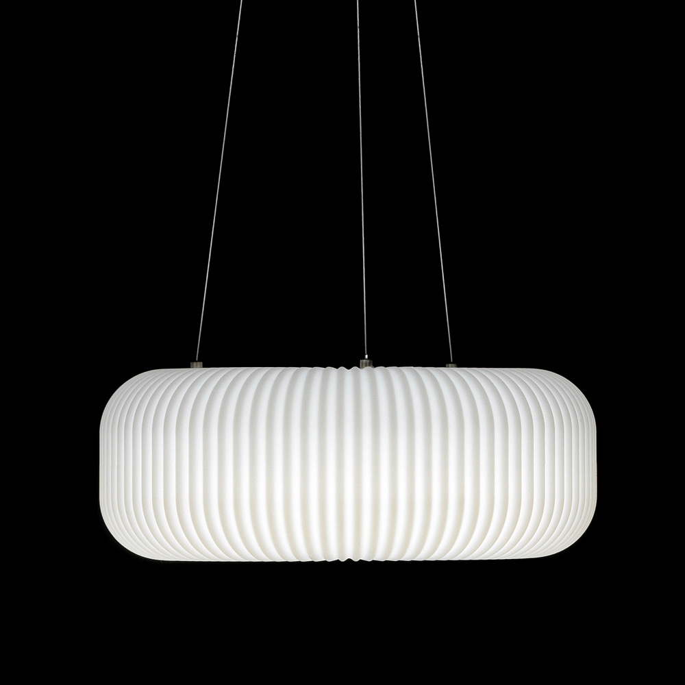 Cette lampe se distingue par son design élégant et minimaliste , qui associe de fins câbles métalliques à un diffuseur en plastique de forme organique. Le plastique, travaillé avec des détails plissés, ajoute une touche de raffinement visuel et contribue à diffuser la lumière de manière douce et uniforme, créant une atmosphère accueillante et relaxante.