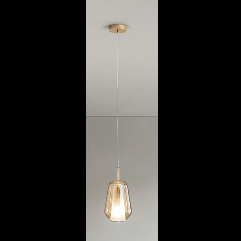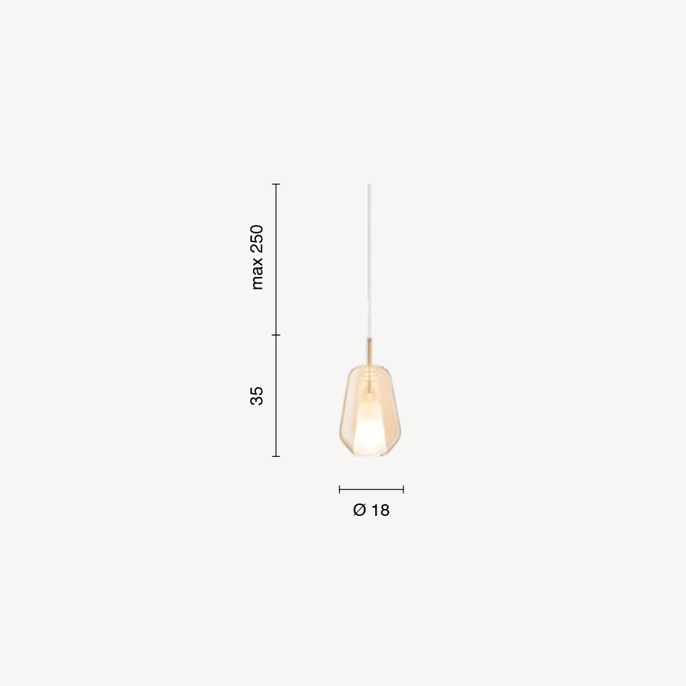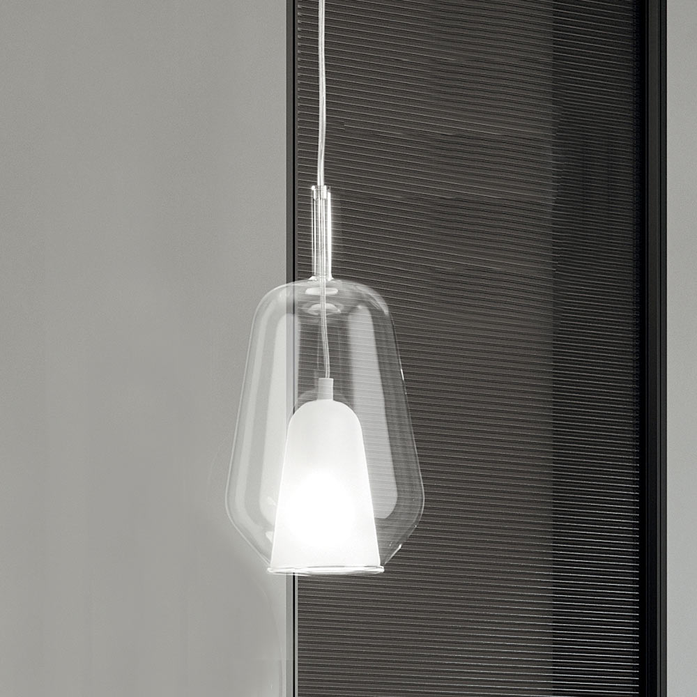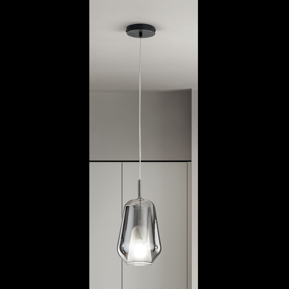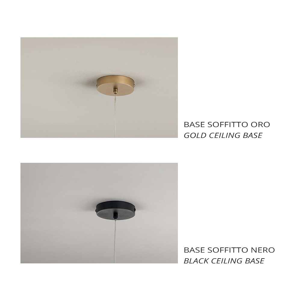 Lampe réalisée avec une base de plafond en métal et un diffuseur en verre soufflé , caractérisée par une double couche : interne en verre satiné et externe en verre coloré . Bouchon en matériau polymère pour stabiliser le câble en position centrale. Câble réglable.