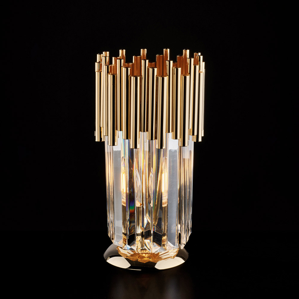 Élégante et précieuse, cette luxueuse lampe de table en fer doré ornée de strass est un luminaire raffiné conçu pour sublimer les espaces d'une lumière chaleureuse et spectaculaire. Sa structure verticale, composée d'éléments cylindriques dorés alternant avec des inserts en strass transparents , crée un jeu de reflets captivant qui illumine la pièce même éteinte.