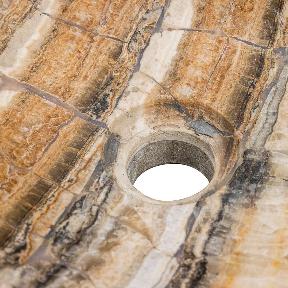 Palata est un lavabo à poser fait main en pierre de rivière avec une mosaïque en pierre d'onyx à l'intérieur.