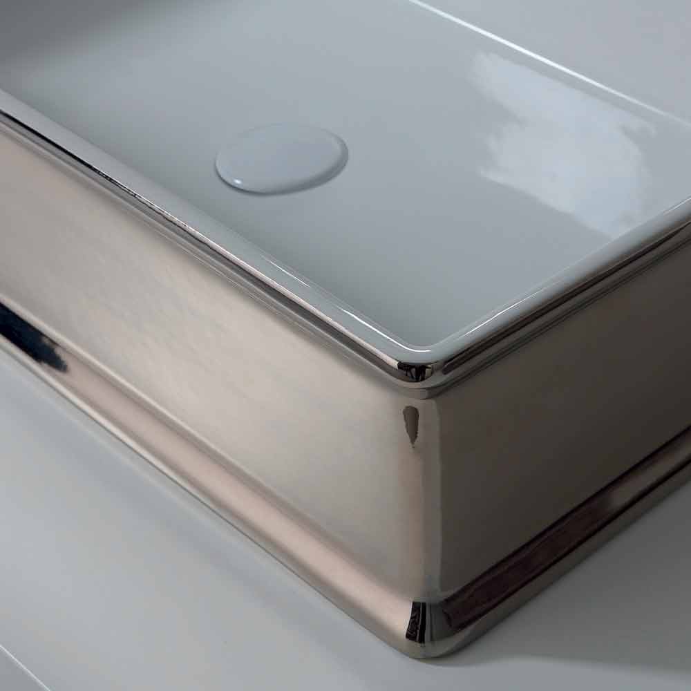 Lavabo à poser en céramique de design moderne Debora fabriqué en Italie Debora est le lavabo à poser réalisé en céramique blanche et platine qui incarne le raffinement et l'élégance sans négliger la fonctionnalité. Conçu et fabriqué à la main en Italie avec des formes sinueuses et troublées par rapport aux autres lavabos, ce détail le rend parfait pour décorer votre salle de bain avec goût.