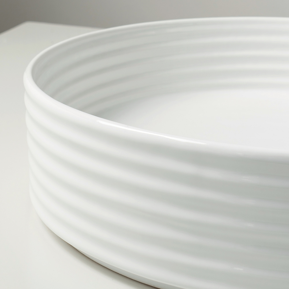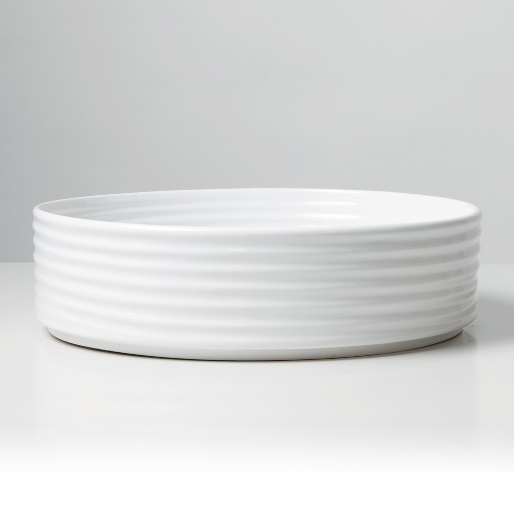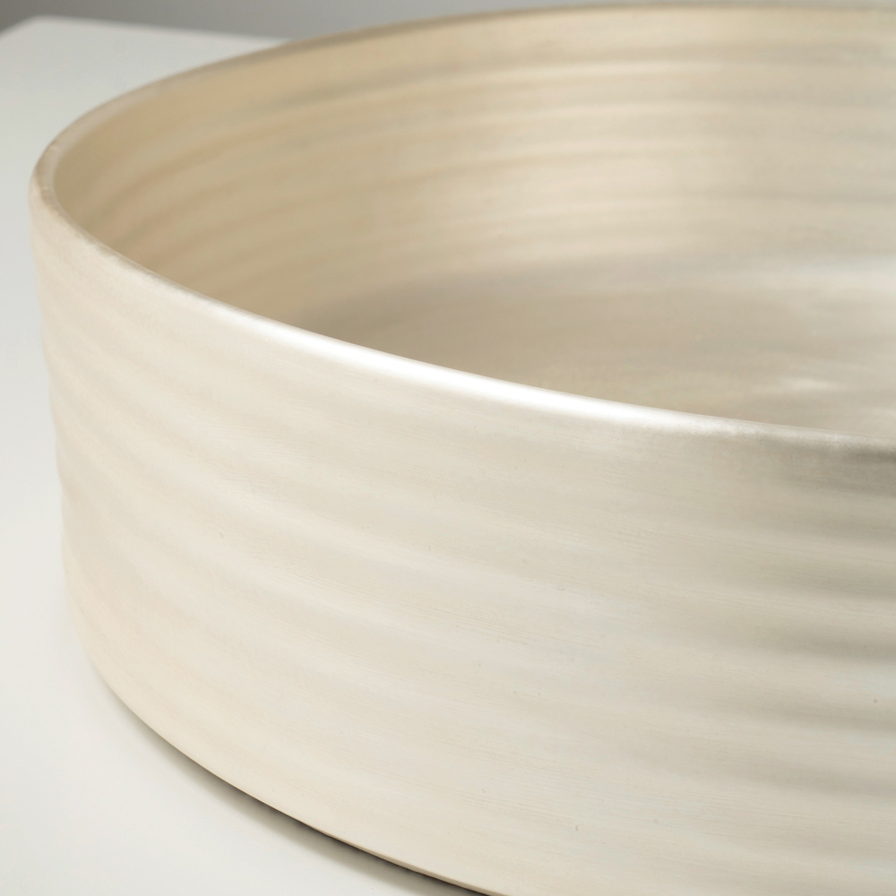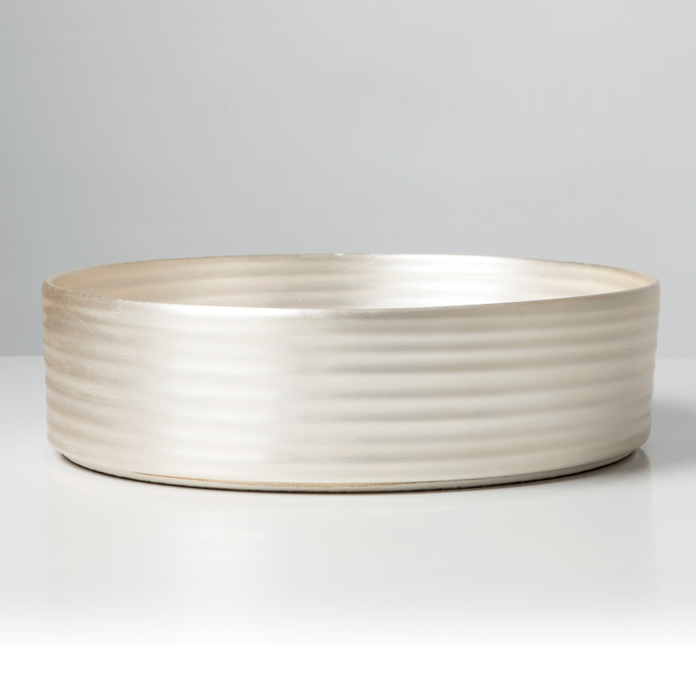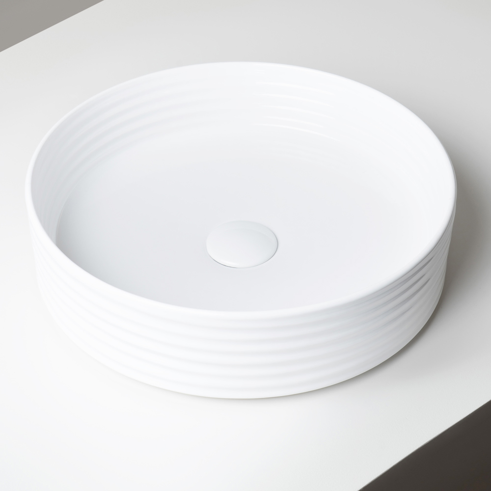 Le lavabo à poser, en grès cérame tourné à la main , incarne la parfaite synthèse entre recherche formelle et savoir-faire artisanal. Ses surfaces ondulées jouent avec la lumière, créant des reflets doux et continus qui confèrent à la matière une présence fluide et élégante.