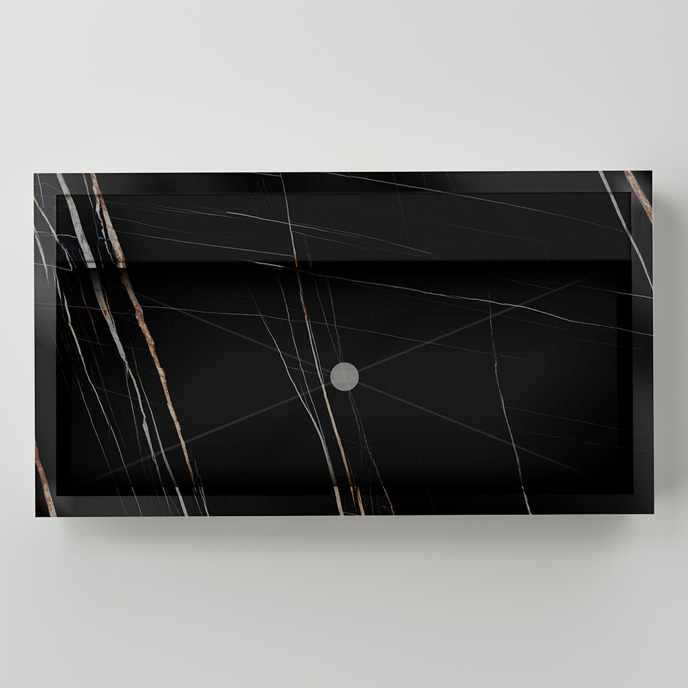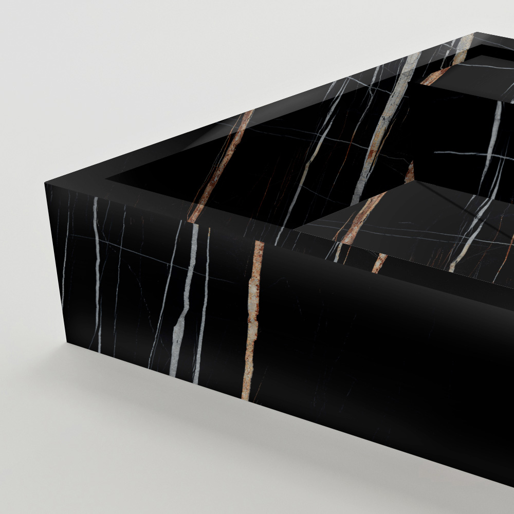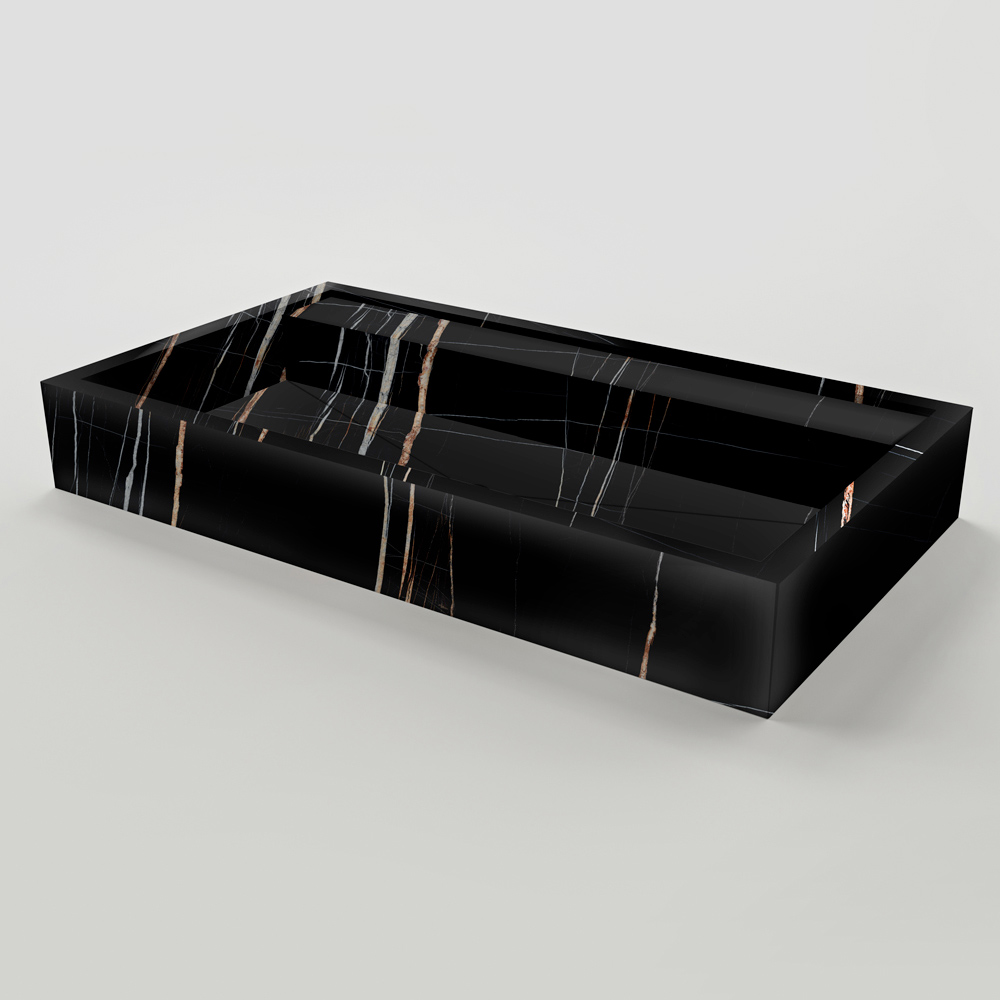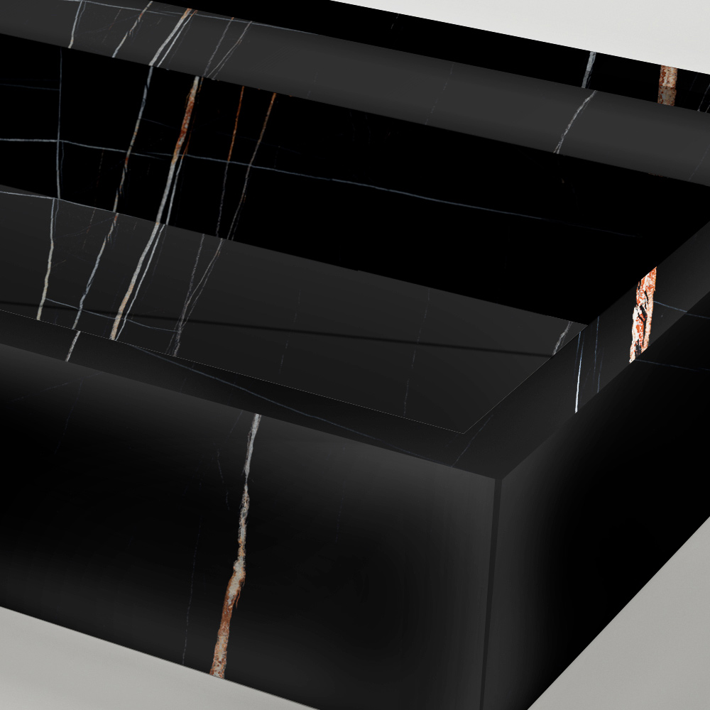 Vasque à poser en grès cérame effet marbre, fabriquée en Italie.