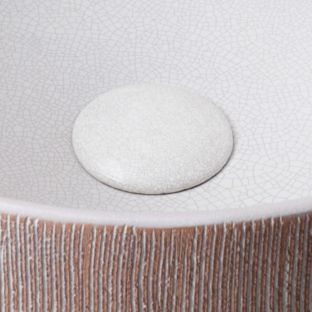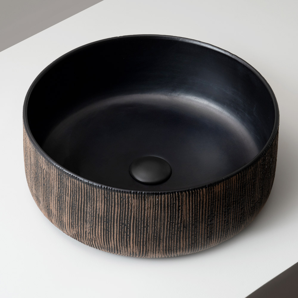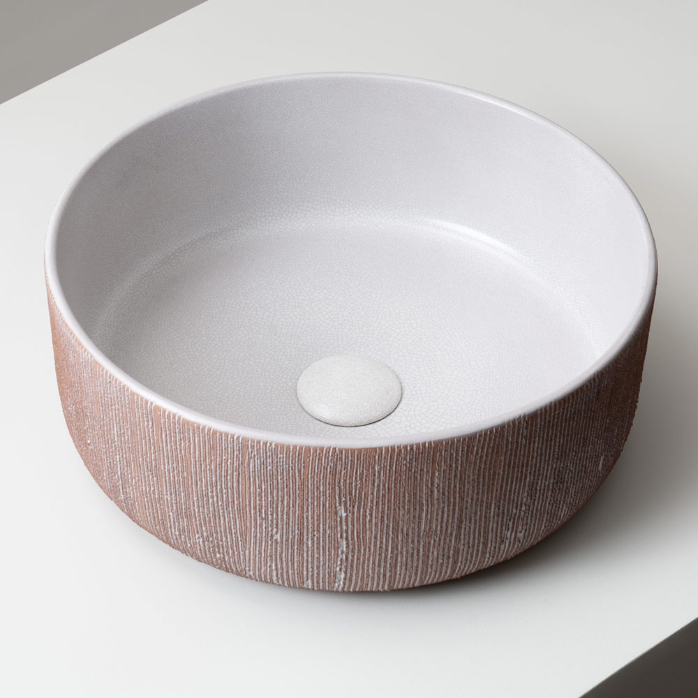 Ce lavabo à poser est fabriqué en terre rouge naturelle et orné de fines stries verticales réalisées à la main . Ces marques, telles des gouttes creusant la roche , créent un effet texturé, sculptural et visuellement saisissant.